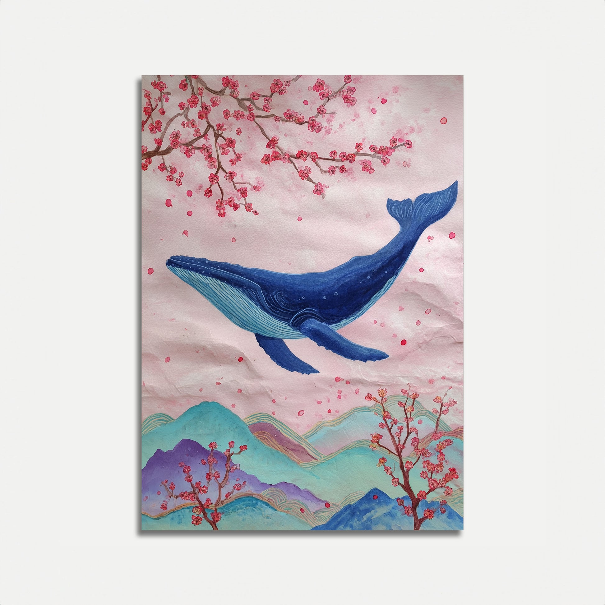 Zanurz się w spokojnym pięknie majestatycznego błękitnego wieloryba unoszącego się z gracją pod baldachimem delikatnych różowych kwiatów wiśni. Ta wspaniała akwarela uchwytuje niematerialne połączenie między oceanicznym łagodnym olbrzymem a delikatnym pięknem wiosny, tworząc zachwycającą podróż wizualną poprzez miękkie różowe i błękitne odcienie. Marzycielski krajobraz falistych gór i opadających płatków dodaje poczucie magicznej spokojności temu niezwykłemu dziełu.