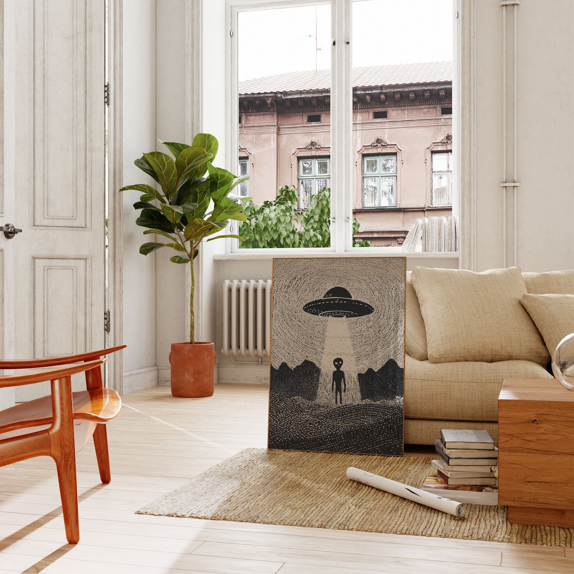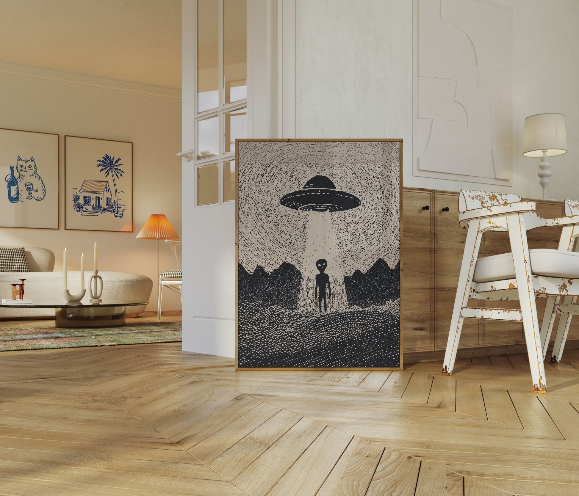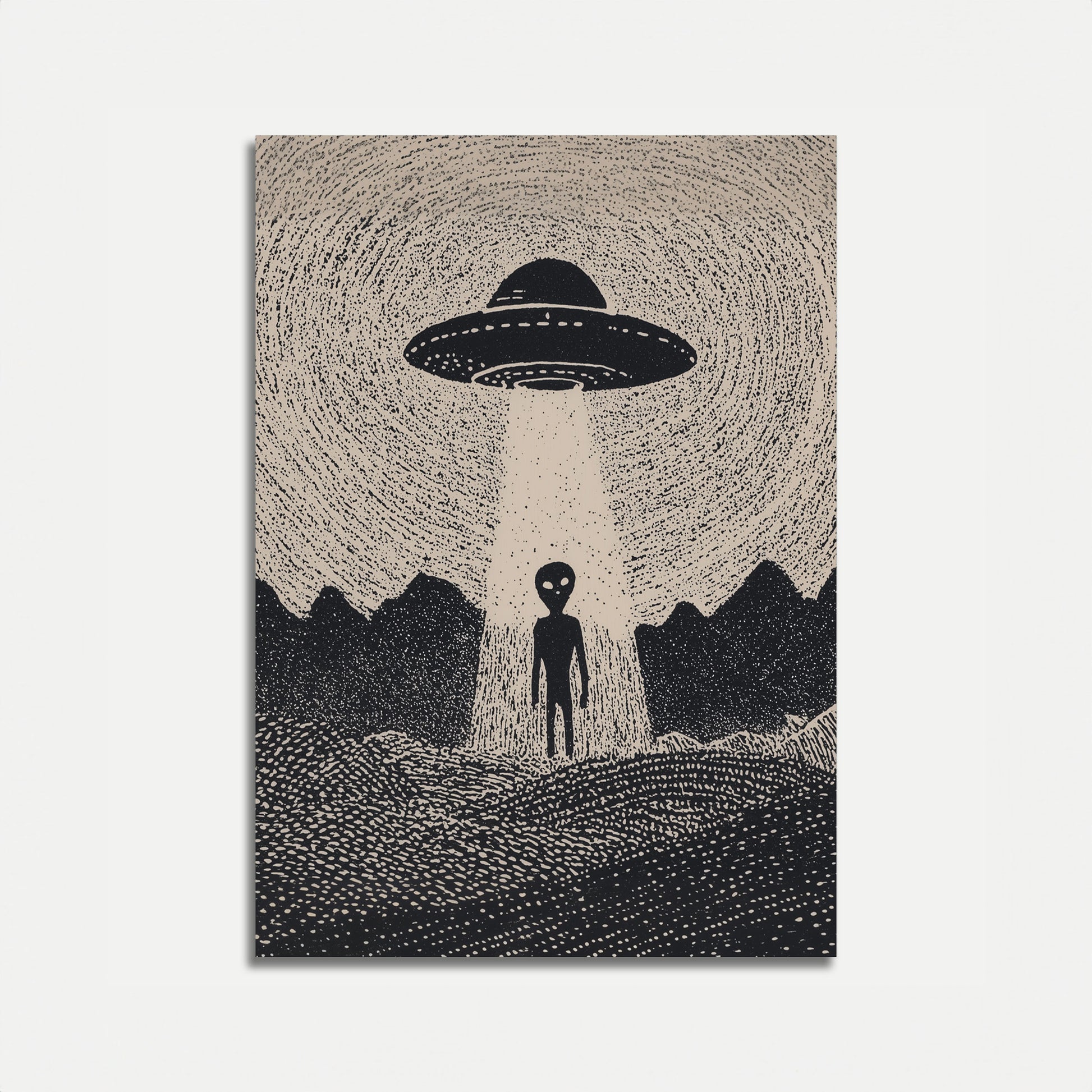 Wkrocz do tajemniczego świata pozaziemskich cudów za pomocą tego uderzającego czarno-białego ilustracji przedstawiającej klasyczny UFO zawieszony nad samotną postacią obcego. Precyzyjny dotwork i ostre kontrasty tworzą atmosferyczną scenę pozaziemskiej tajemnicy, która porusza wyobraźnią miłośników science fiction i eksploracji kosmosu. Ta zachwycająca praca artystyczna ożywia zagadkę spotkań z obcymi z przejmującą prostotą.