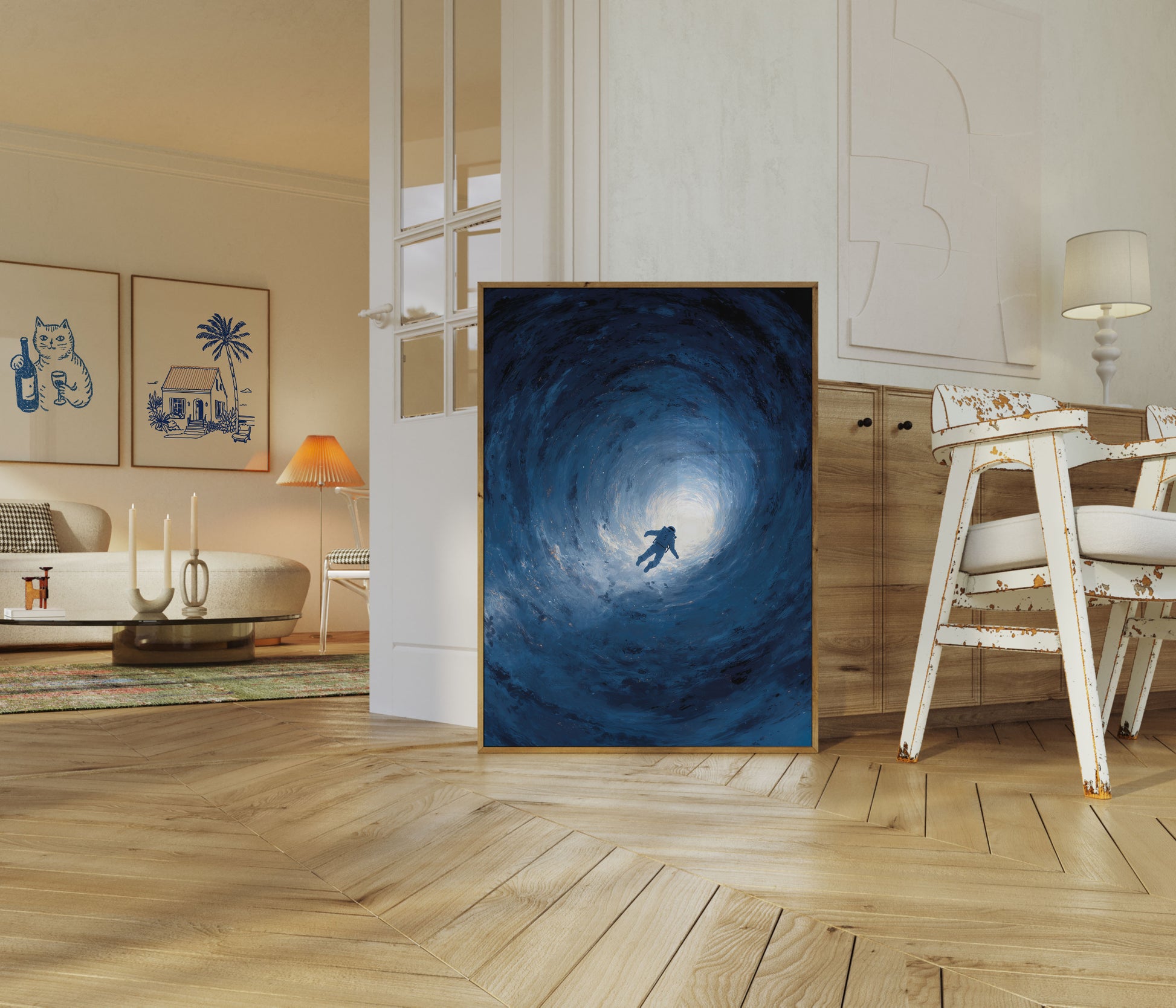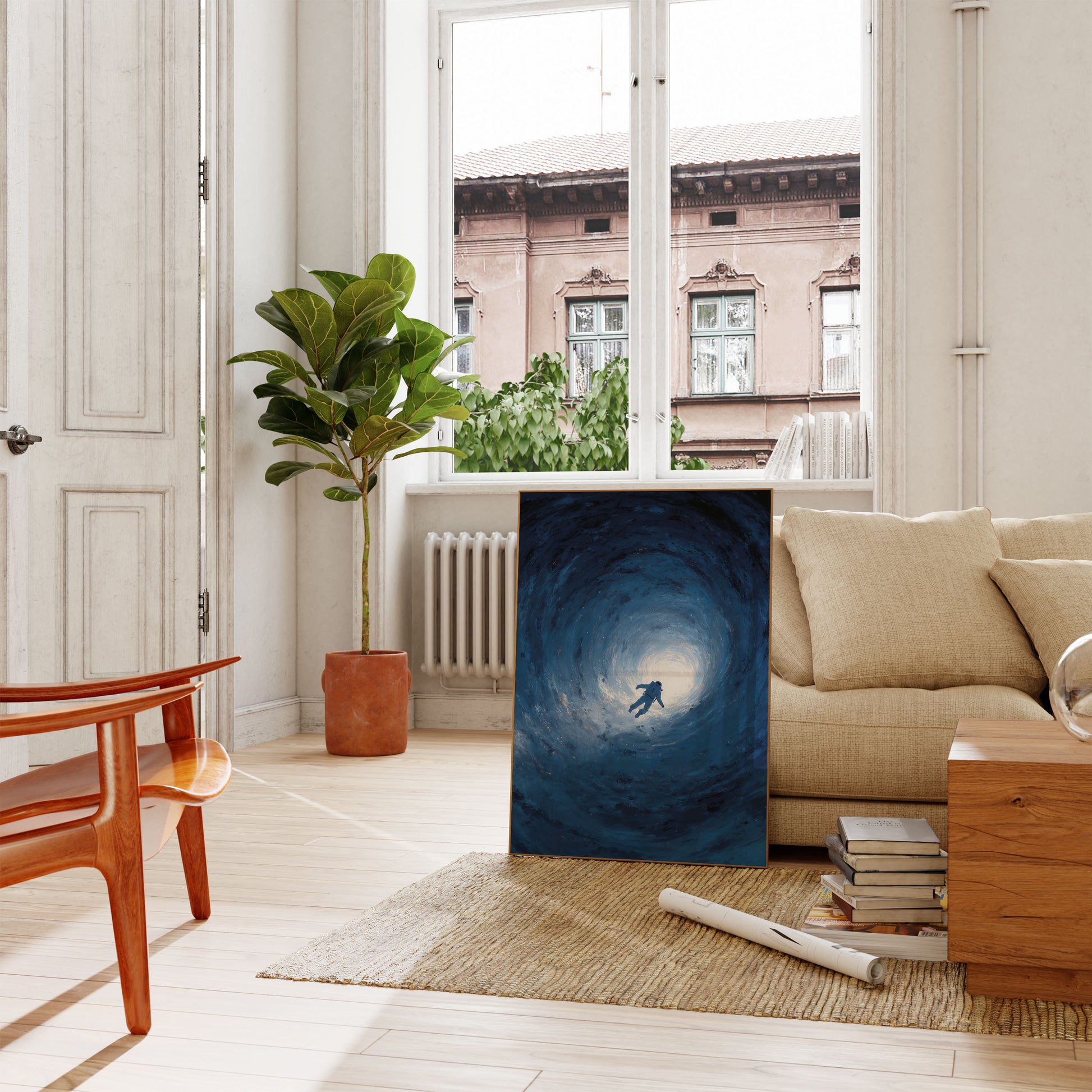 Samotny astronauta dryfuje przez hipnotyzujący, błękitny kosmiczny tunel, sylwetką wyróżniając się na tle brilliant białego światła. Wirujące, efemeryczne otoczenie tworzy poczucie izolacji i zachwytu, uchwycając wzniosłe piękno i tajemnicę eksploracji kosmosu. Ta oszałamiająca narracja wizualna przemawia do ludzkiego ducha przygody i nieznanego.