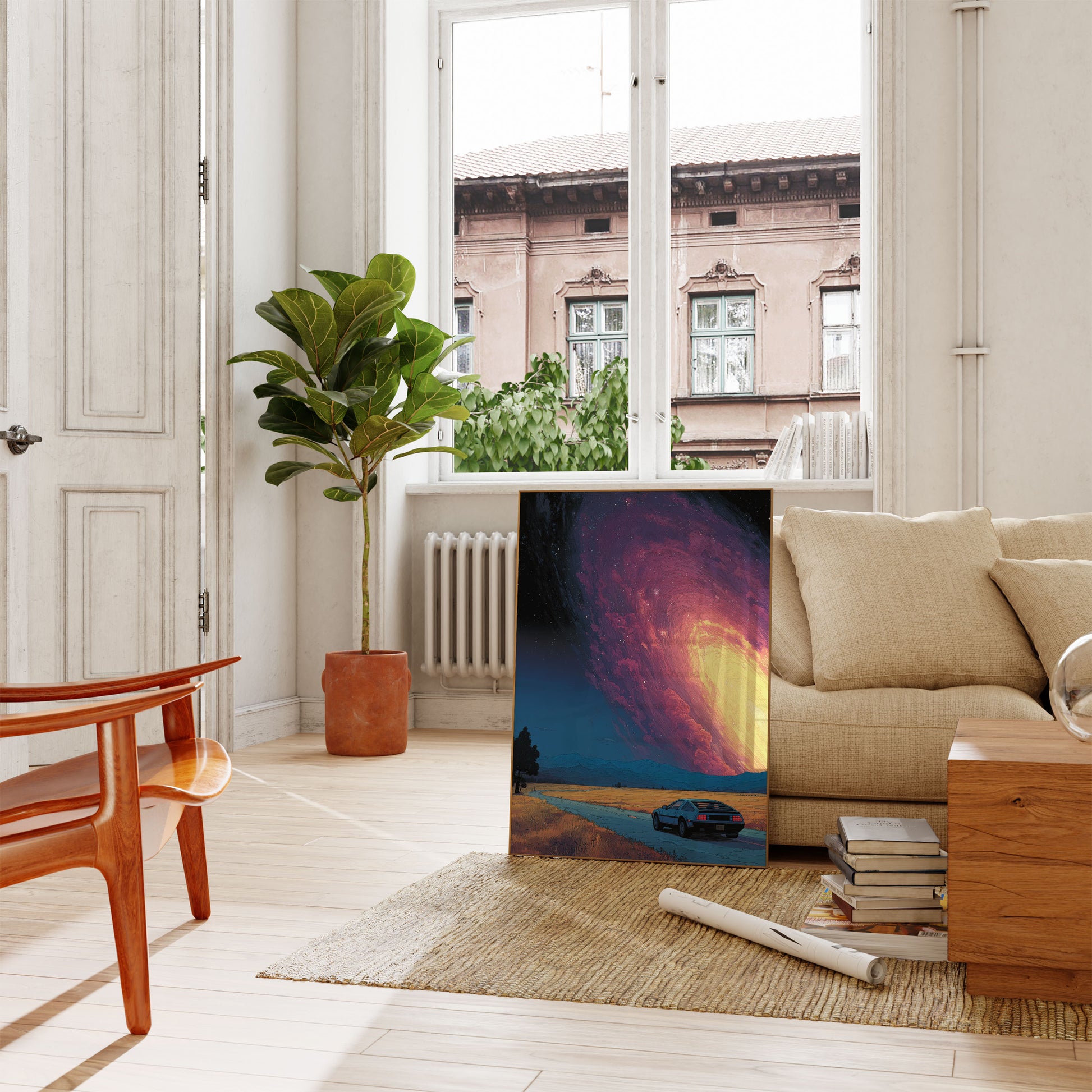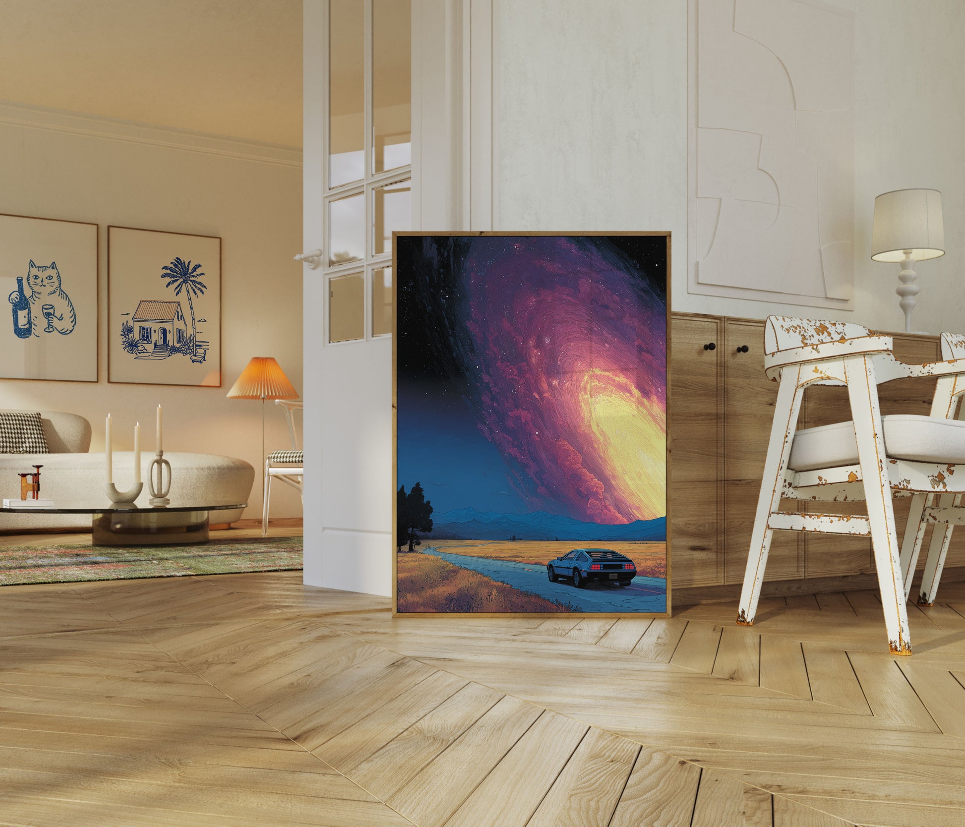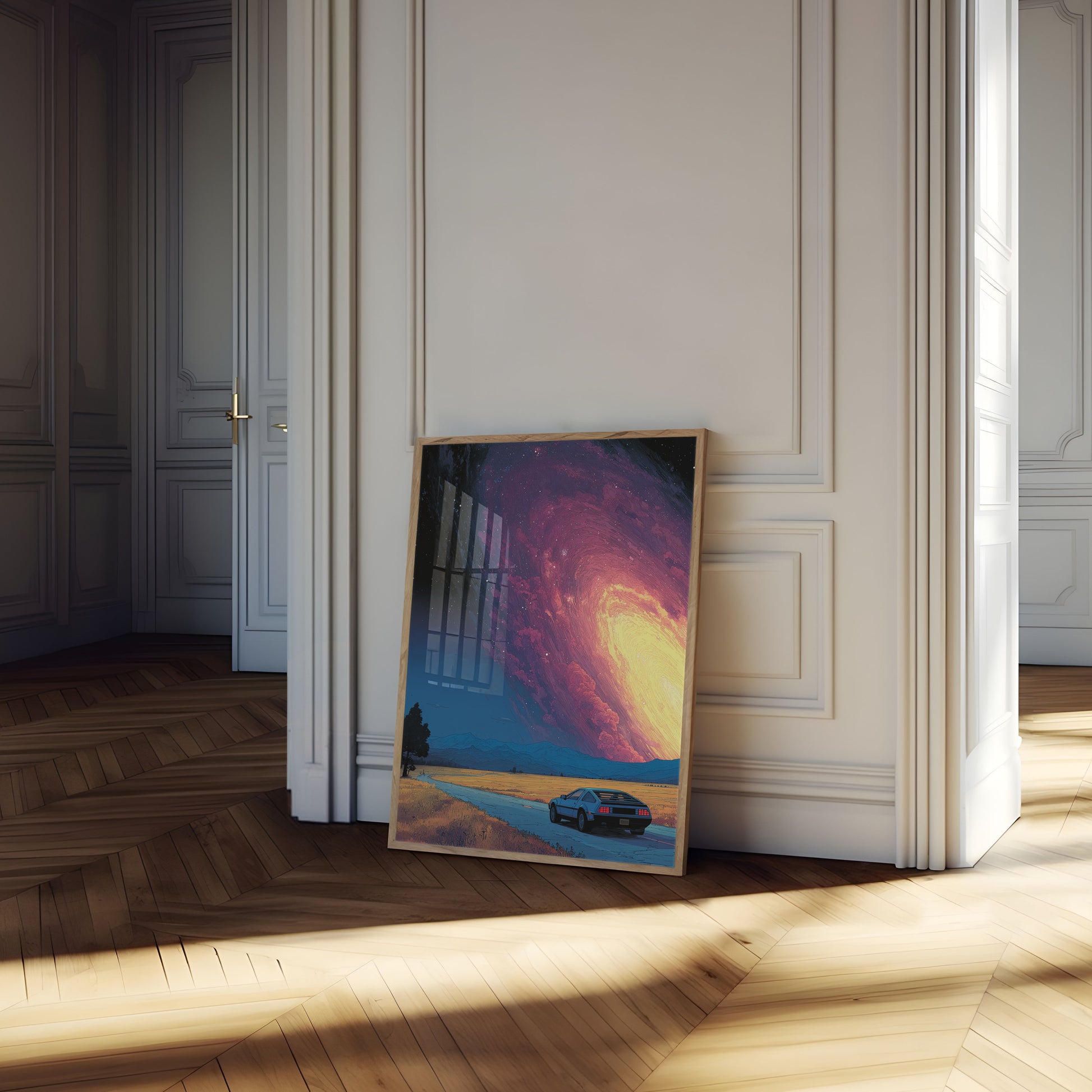To oszałamiające dzieło sztuki przedstawia klasyczny samochód sportowy z lat 80. zaparkowany na tle nieziemskiego krajobrazu, w którym ogromne, świecące kosmiczne zjawisko dominuje na niebie. Utwór pięknie łączy retro nostalgię z sci-fi czarem, zawierając żywe gradienty przechodzące z głębokich purpur i magenty na brylantowe złote żółcie. Surrealistyczną atmosferę wzmacniają wirujące formacje chmur i gwiaździste nieba, tworząc marzycielską scenę, która budzi zarówno spokój, jak i podziw. Idealny dla fanów vintage'u, eksploracji kosmosu i odważnych wizji artystycznych, ten plakat Retro Car and Cosmic Sky stanowi niezapomniane stwierdzenie w każdym pokoju.
