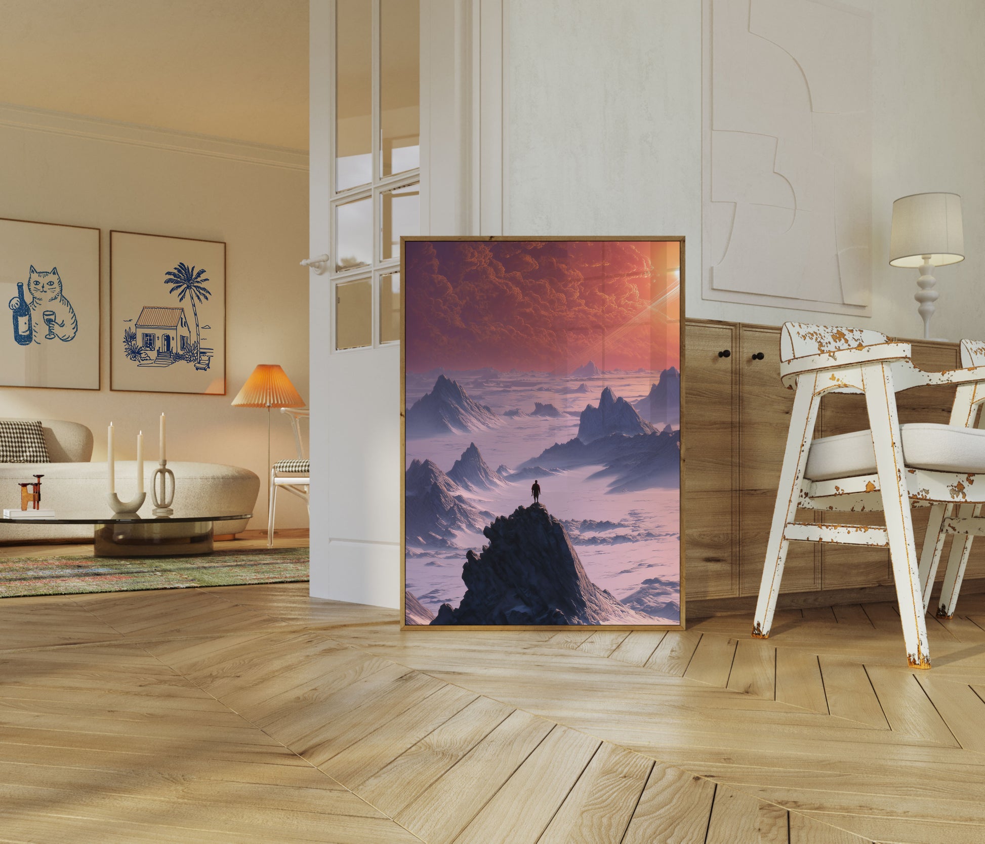 Ta oszałamiająca grafika science fiction ukazuje samotną postać stojącą na szczycie skalnego szpiczastego wzniesienia, patrzącą na obcą, pozaziemską krajobraz skąpaną w dramatycznych pomarańczowych i fioletowych odcieniach. Wznoszące się krystaliczne formacje skalne przebijają się przez warstwy mgły atmosferycznej, podczas gdy intensywna gwiazda i wirujące chmury dominują na niebie powyżej. Kompozycja wywołuje głębokie poczucie przygody, samotności i zdumienia—idealne dla marzeń, entuzjastów science fiction i każdego, kto chce uciec na odległe światy. Bogata paleta barw i kinematograficzne detale tworzą wciągającą atmosferę, która przekształca każdą przestrzeń w portal do innego wymiaru.