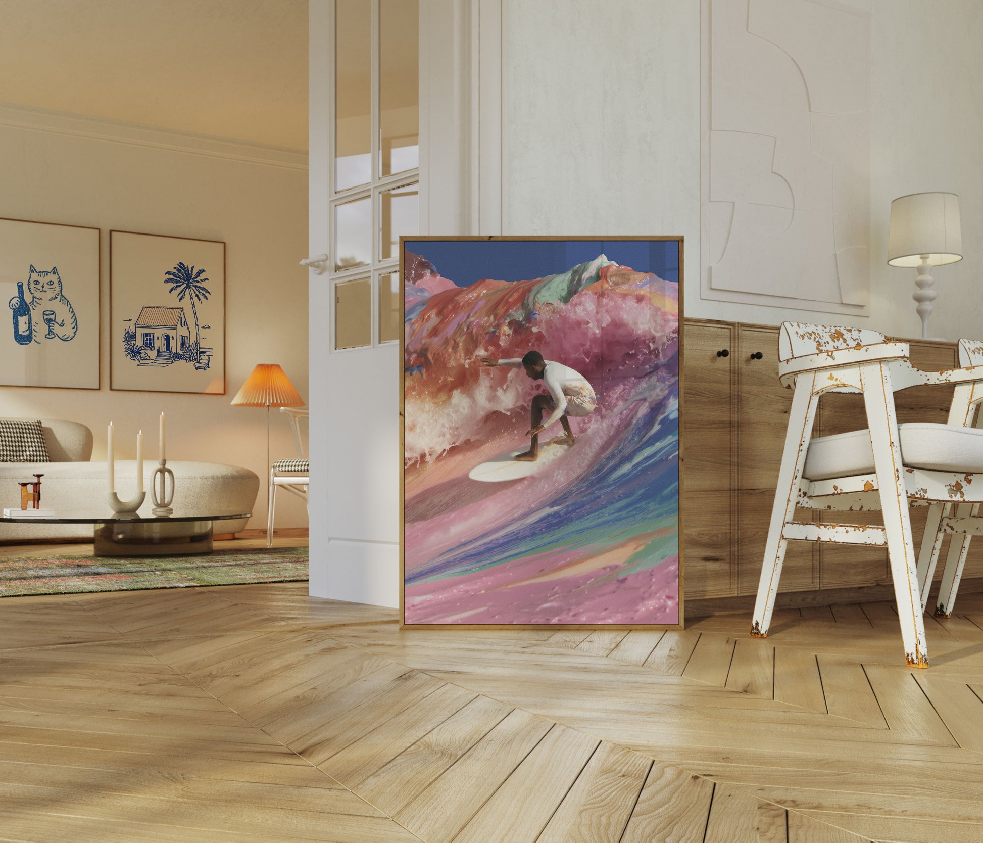 Złap magię oceanu dzięki tej oszałamiającej plakacie surfera z istniejącymi, marzycielskimi falami w odcieniach różu, koralowego, niebieskiego i zielonego. Ta dynamiczna praca sztuki uchwycone doskonały moment surfisty w akcji, jadącego na ogromnej fali namalowanej z niesamowitymi szczegółami i ruchem. Żywa paleta barw i świetlista jakość tworzą energetyczną, prawie surrealną atmosferę, która ożywia na Twojej ścianie thrill i piękno surfingu.