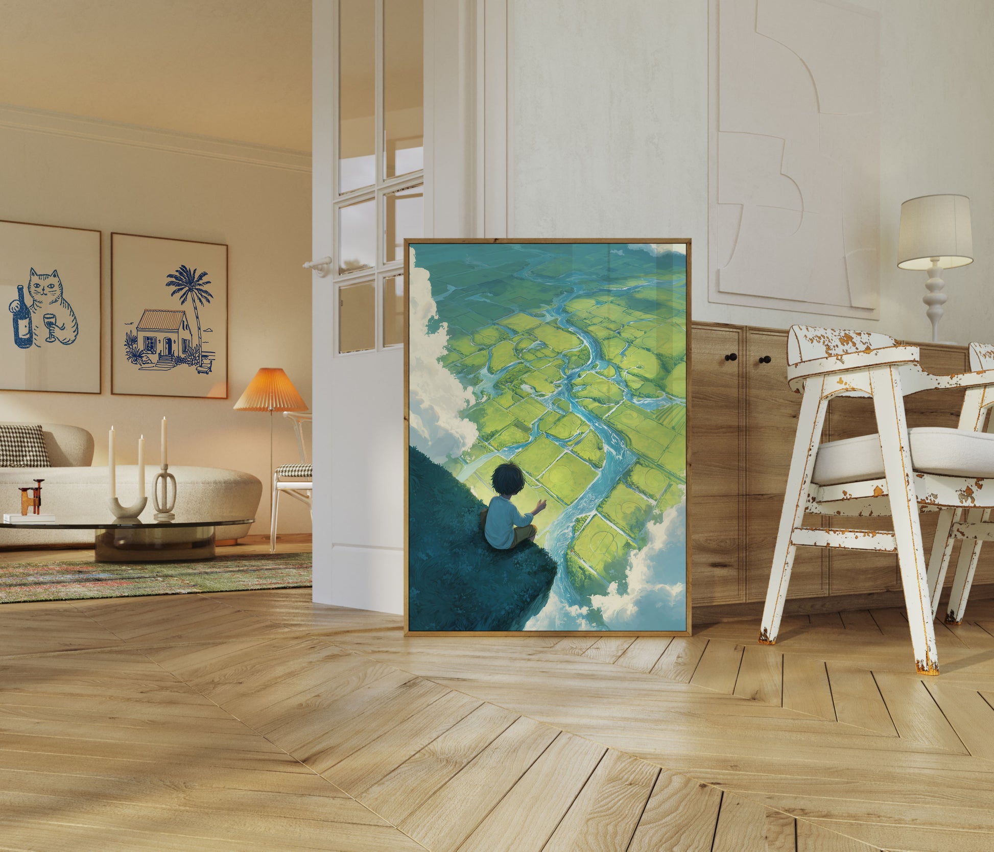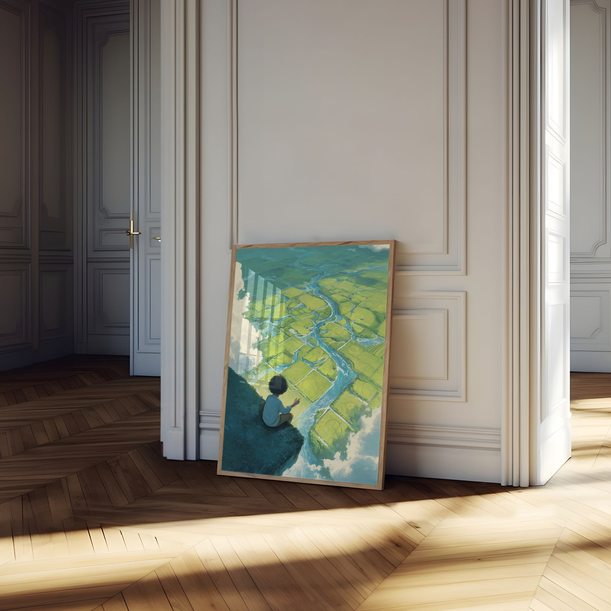 Zapierający dech w piersiach widok z lotu ptaka ujawnia hipnotyzujący krajobraz szmaragdowozielonych pól starannie przeplatanych wijącymi się błękitnymi rzekami. Samotna postać siedzi na ciemnej skale, spoglądając na geometryczną mozaikę pól uprawnych i dróg wodnych, tworząc wrażenie spokojnej kontemplacji i naturalnego cudu.
