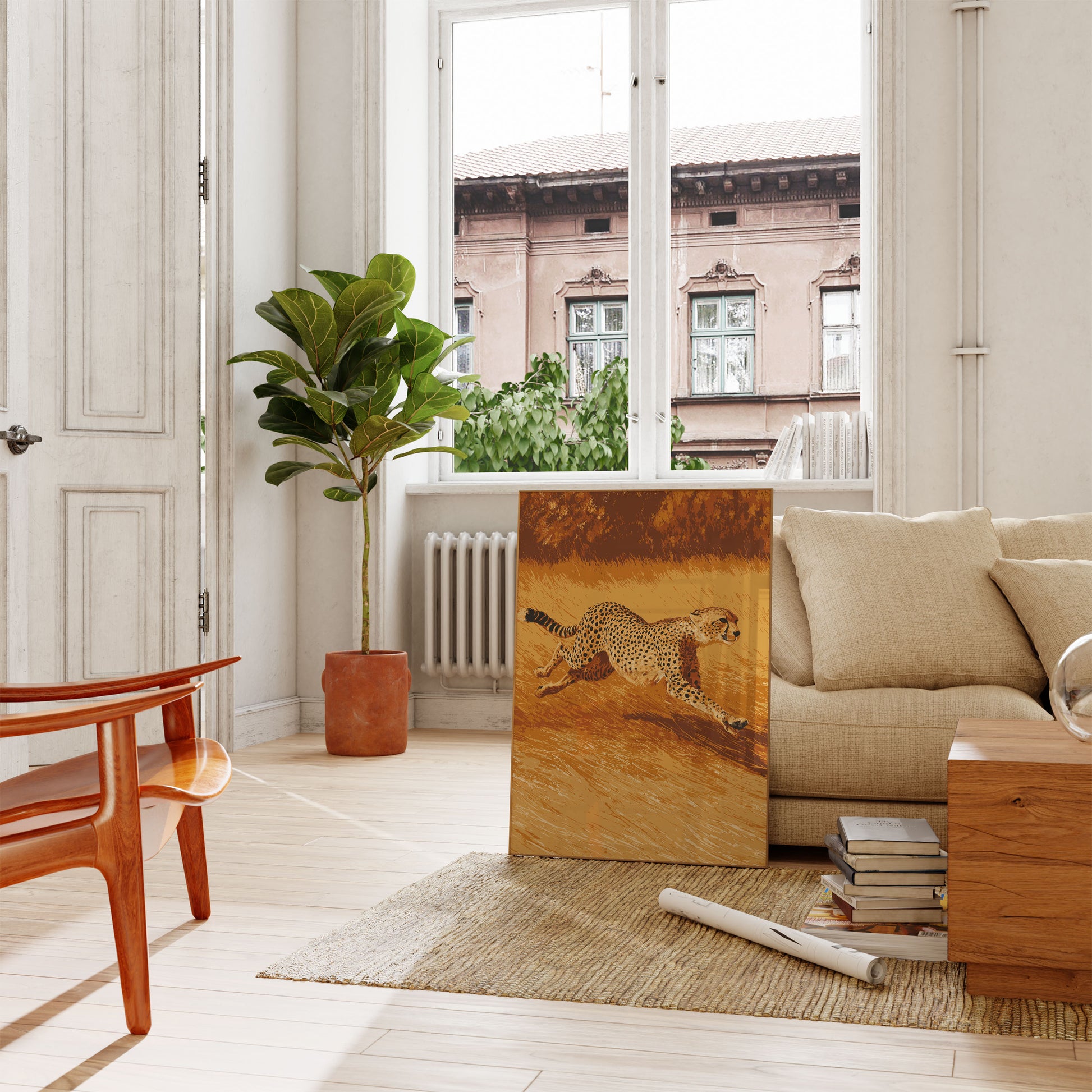 Uchwycić surową szybkość i wdzięk najszybszego lądowego zwierzęcia natury dzięki temu oszałamiającemu dziełu sztuki przedstawiającemu geparda. Ta dynamiczna ilustracja ukazuje elegancką gepardkę w pełnym sprincie przez złote łąki, jej charakterystyczne cętkowane futerko wyrenderowane w bogatych, ciepłych tonach ziemi, które przywołują afrykańską sawannę. Kompozycja doskonale równoważy energię ruchu z spokojnym krajobrazem pustynnym, tworząc dzieło sztuki, które przenosi majestat dzikiej przyrody bezpośrednio do Twojej przestrzeni.