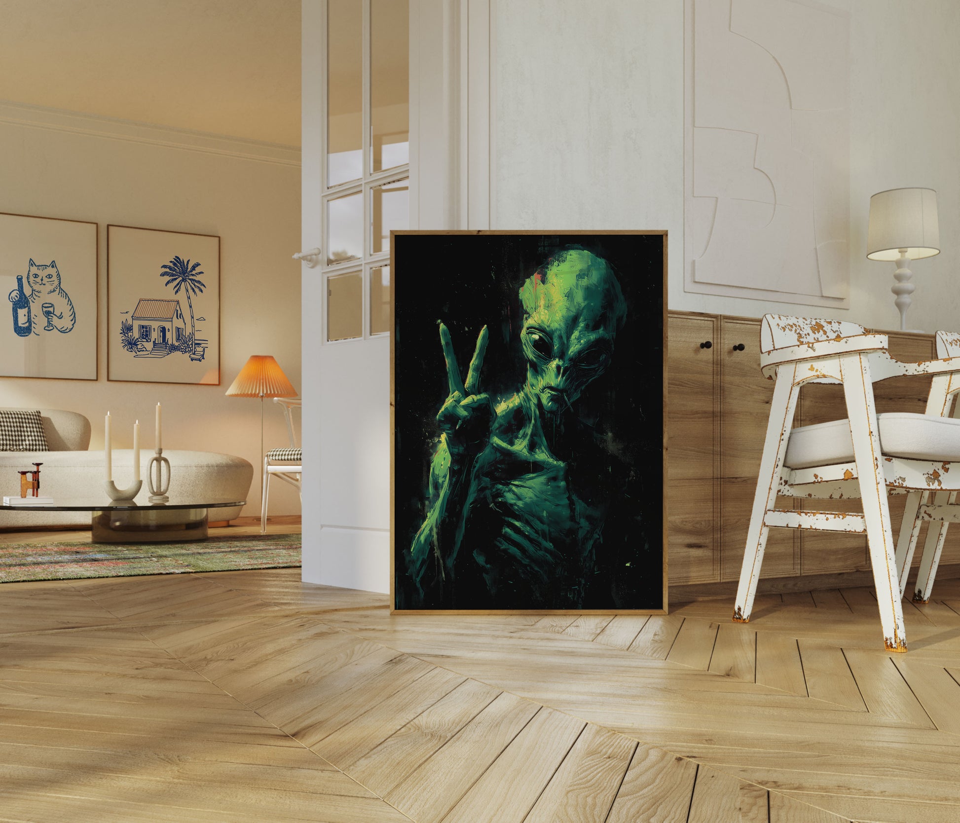 Przejmująco wyrazisty zielony kosmita pokazuje znak pokoju w tej elektryzującej pracy artystycznej. Mroczny i tajemniczy, pozaziemski bohater wyłania się z mrocznych głębin z intensywną, malarską estetyką, która uchwytuje zarówno pozaziemskie zagrożenie, jak i niespodziewany spokój. Głębokie szmaragdowe i seledynowe tony tworzą dramatyczny, niemal świecący portret spotkania z obcym.
