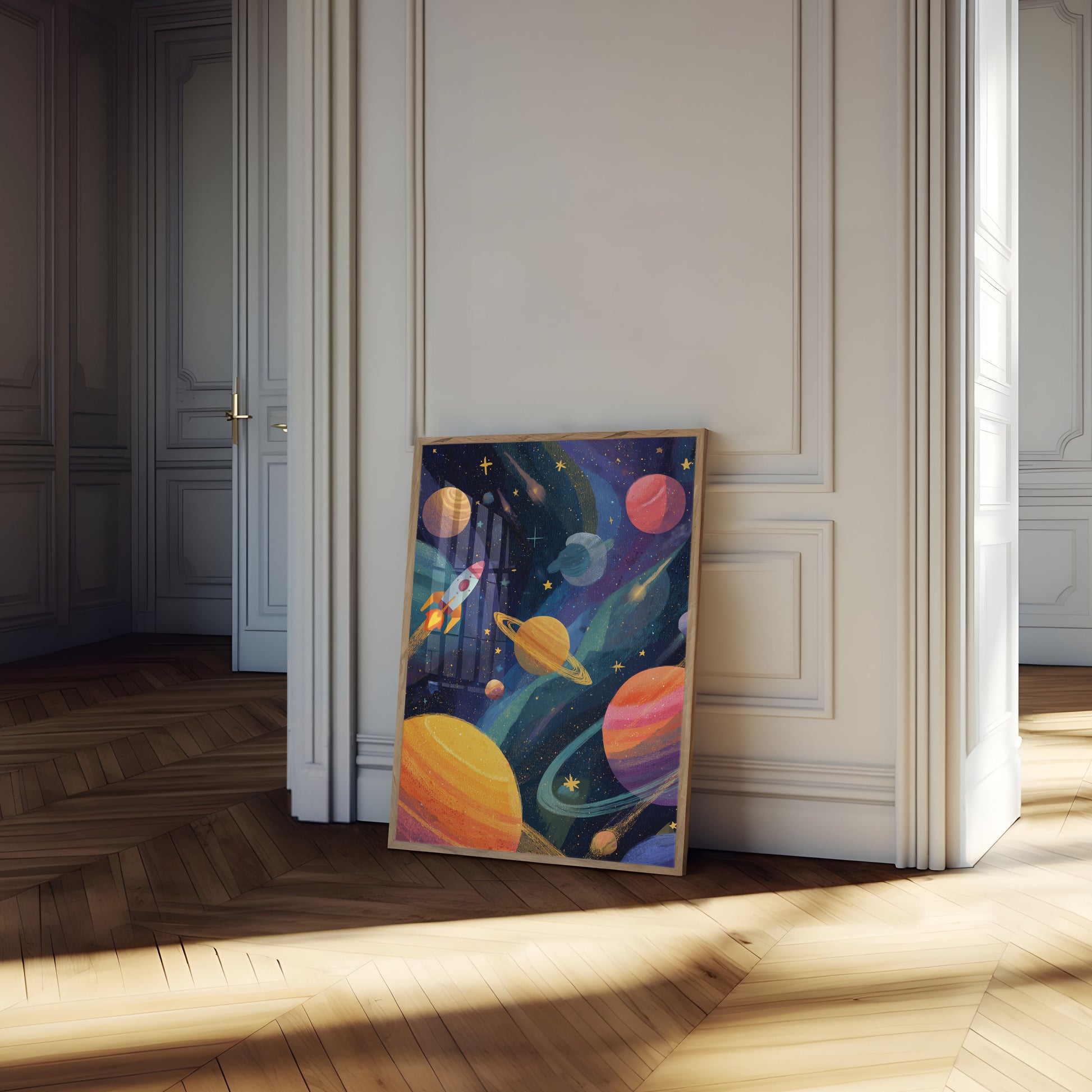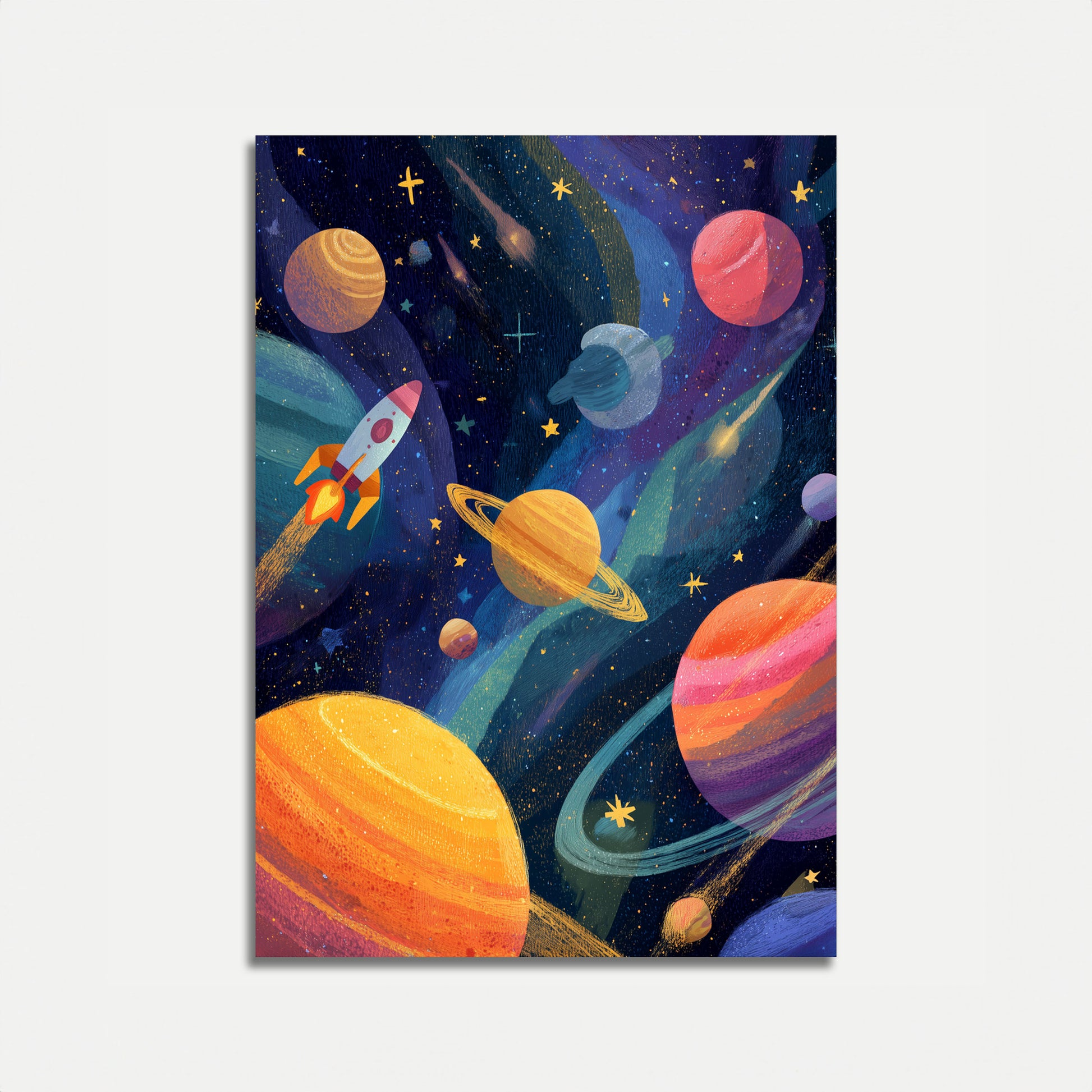 Zanurz się w niezwykłej podróży przez tętniącą życiem galaktykę, pełną kolorowych planet, migoczących gwiazd i klasycznego statku kosmicznego. Ta wyobraźniowa ilustracja przestrzeni kosmicznej uchwytuje cudowność eksploracji międzygwiezdnej poprzez swoją bogatą, wirującą paletę kolorów i zabawny design planet. Każde ciało niebieskie opowiada historię kosmicznej przygody i nieograniczonej wyobraźni.