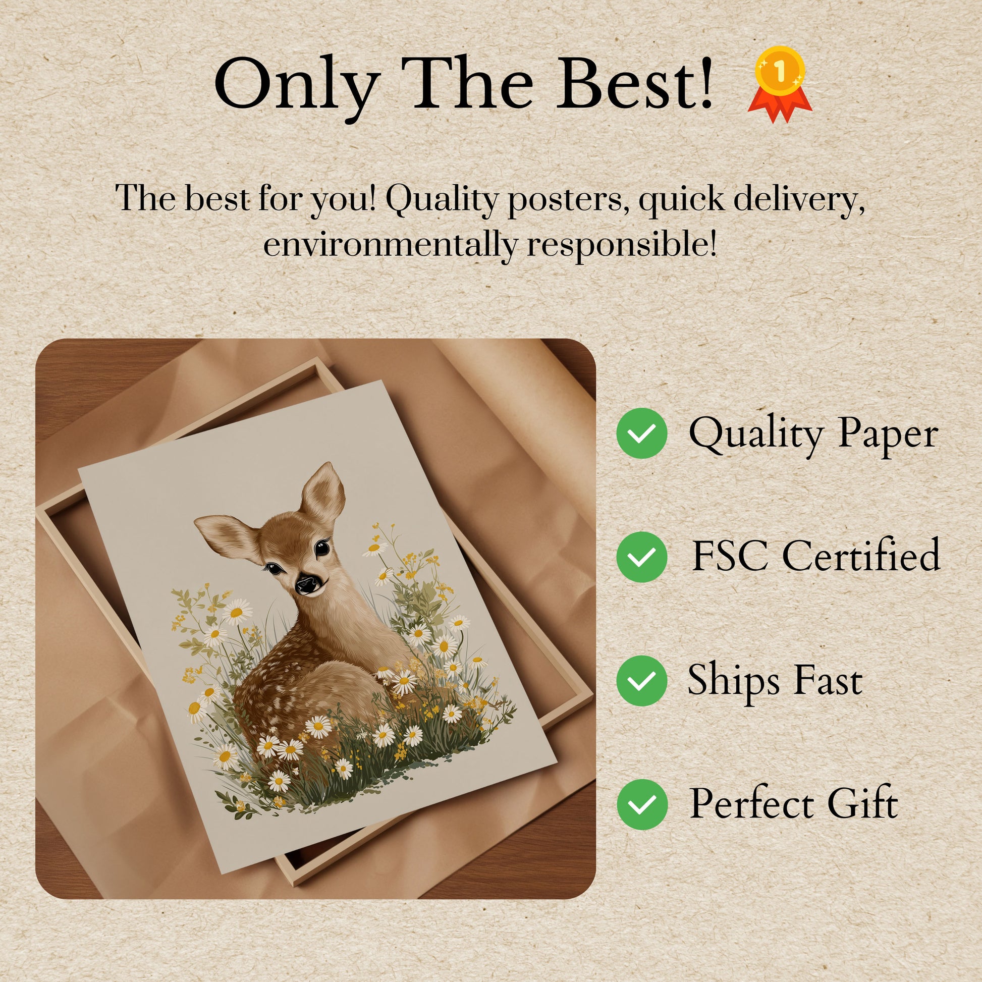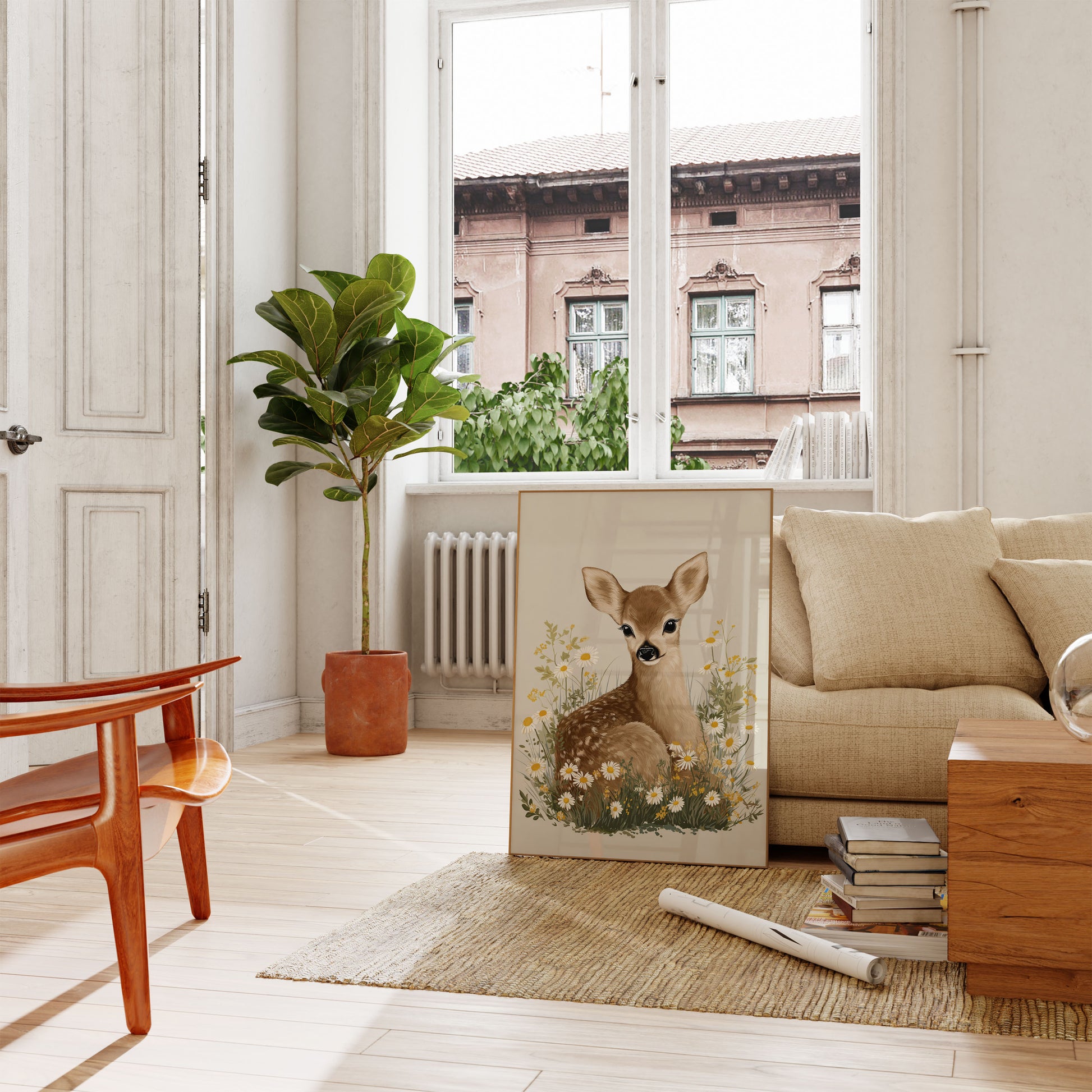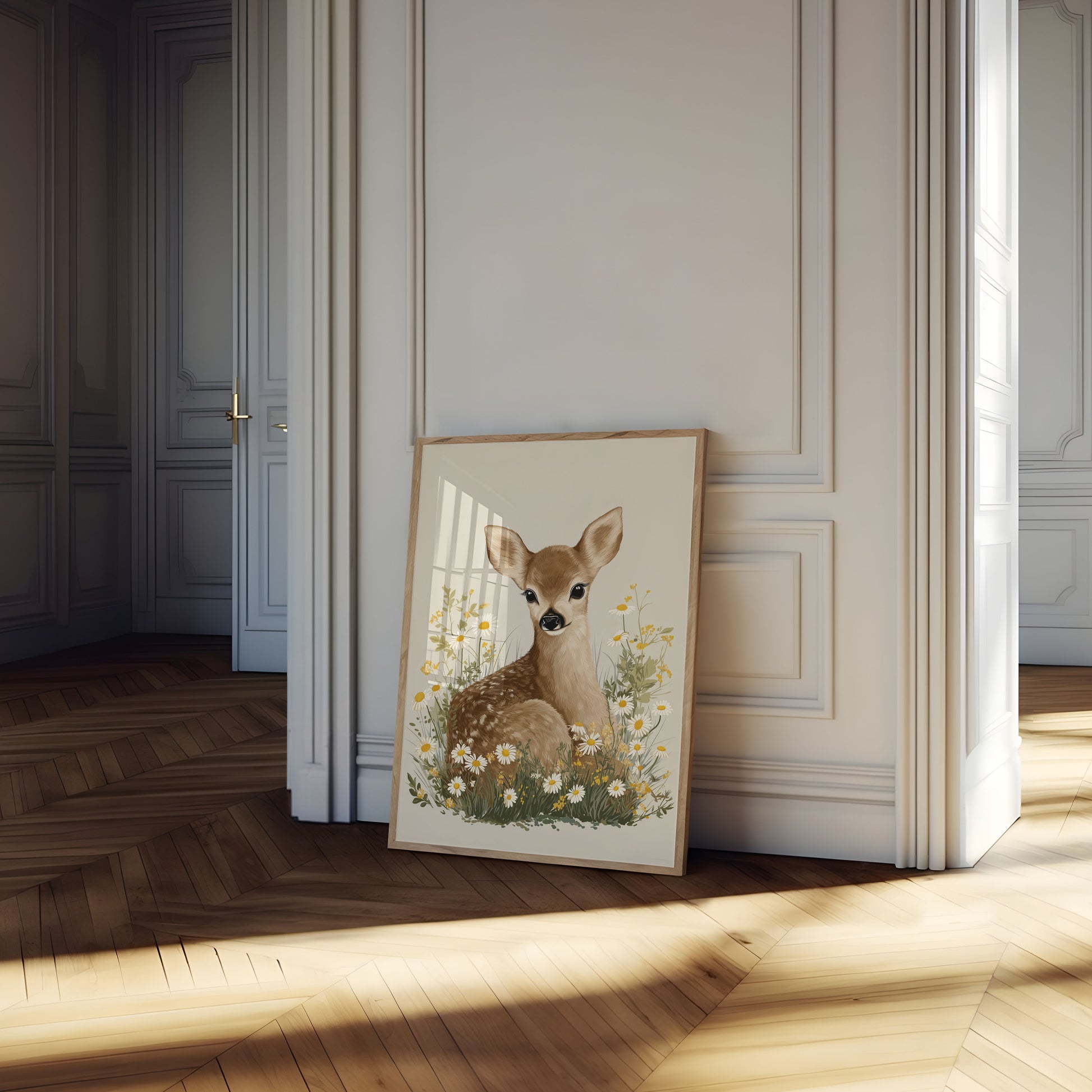 Ta urocza ilustracja przedstawia łagodnego jelenia otoczonego żywą rabatą białych stokrotek i wesołych żółtych dzikich kwiatów. Miękka, ciepła paleta barw i delikatne botaniczne szczegóły tworzą spokojną i serenu atmosferę, która przynosi piękno przyrody do każdego pokoju. Słodki wyraz twarzy jelenia oraz bujne kwitnące kompozycje budzą poczucie spokojnego zadziwiania, czyniąc to idealnym wyborem dla tych, którzy kochają dziką przyrodę i naturalne krajobrazy.