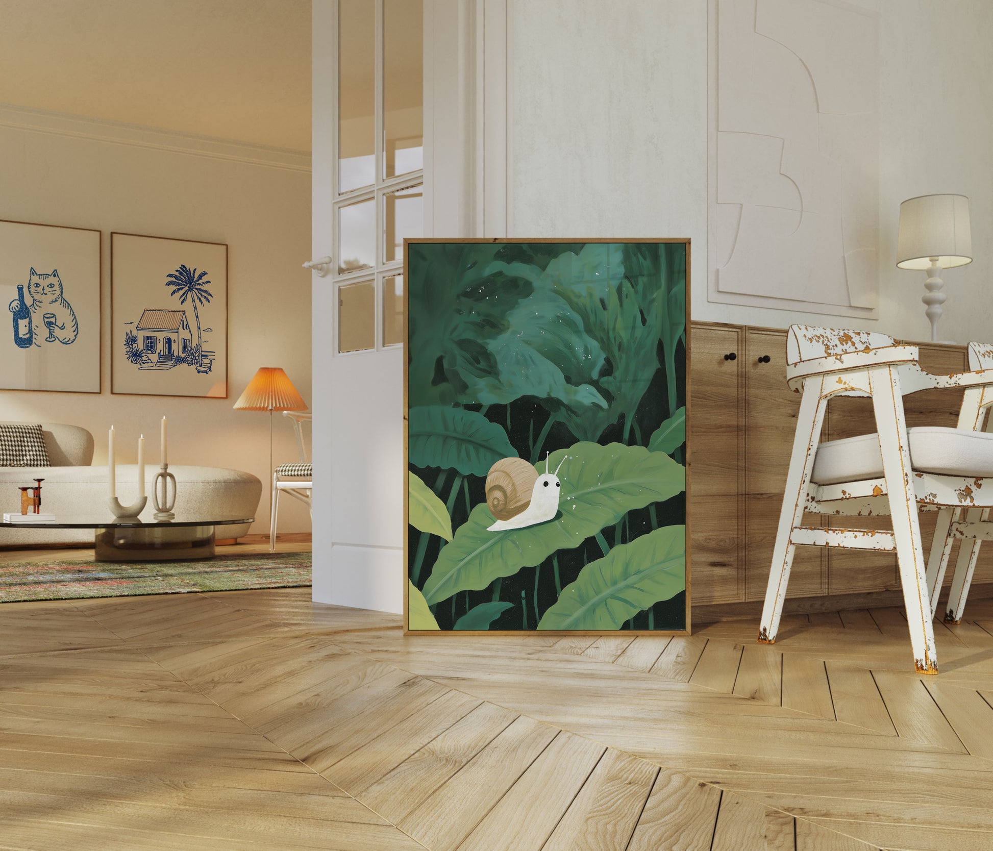 Ta urocza ilustracja uchwycza delikatny moment w naturze z ciekawym ślimakiem odpoczywającym na tętniącym zielenią liściu. Otoczona bujną botaniczną roślinnością w różnych odcieniach szmaragdu i szałwii, praca sztuki tworzy spokojną, intymną atmosferę, która celebruje piękno małych stworzeń. Miękki, marzycielski styl artystyczny z delikatnymi pociągnięciami pędzla i błyszczącymi szczegółami przynosi poczucie zdumienia i spokoju do każdej przestrzeni, co czyni go idealnym dla miłośników przyrody i osób poszukujących uspokajającej, inspirowanej ogrodem estetyki.