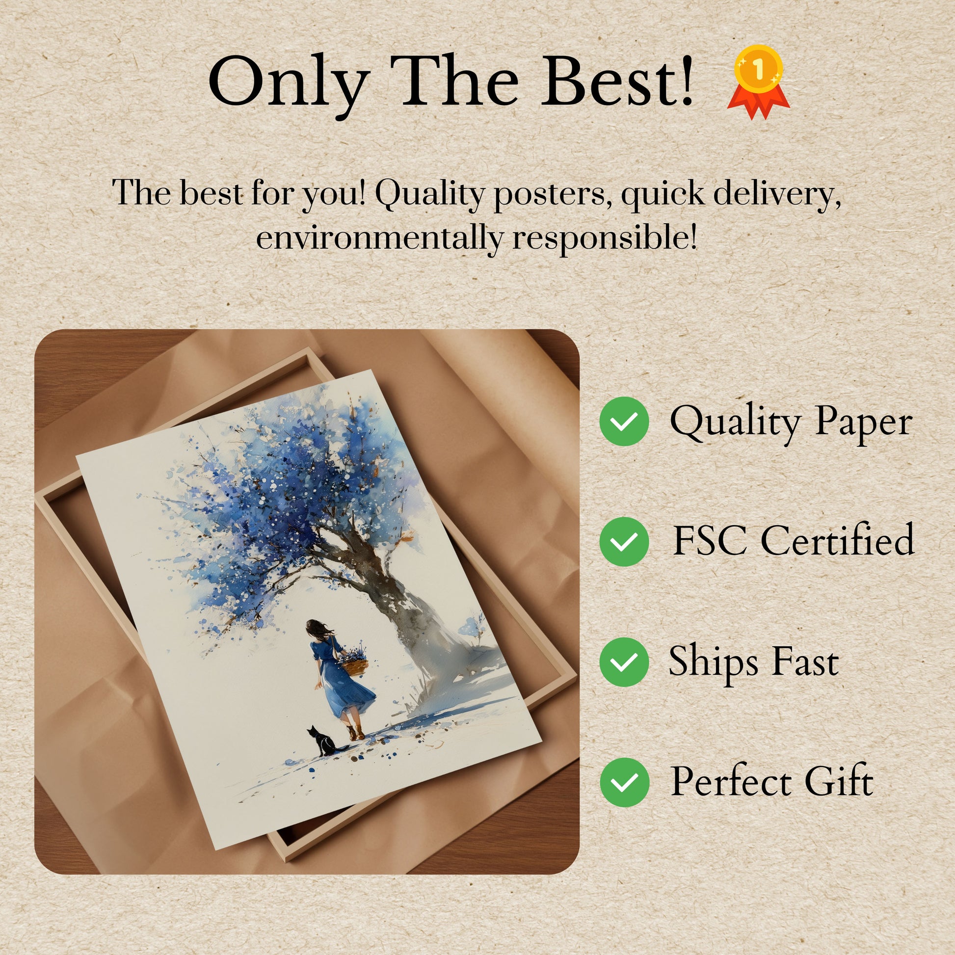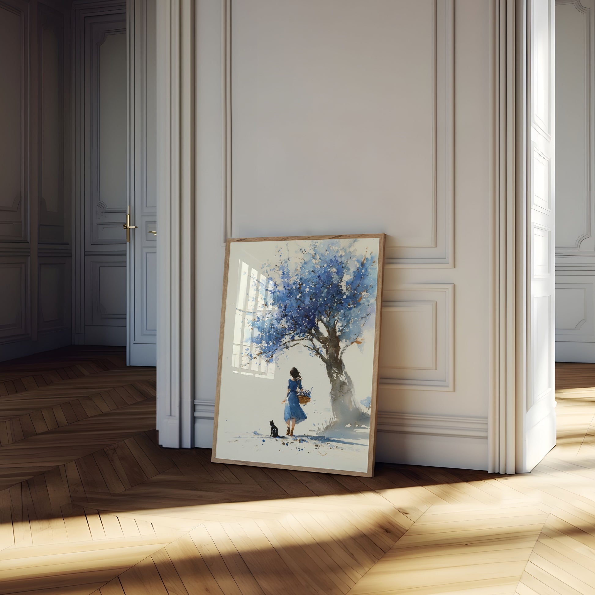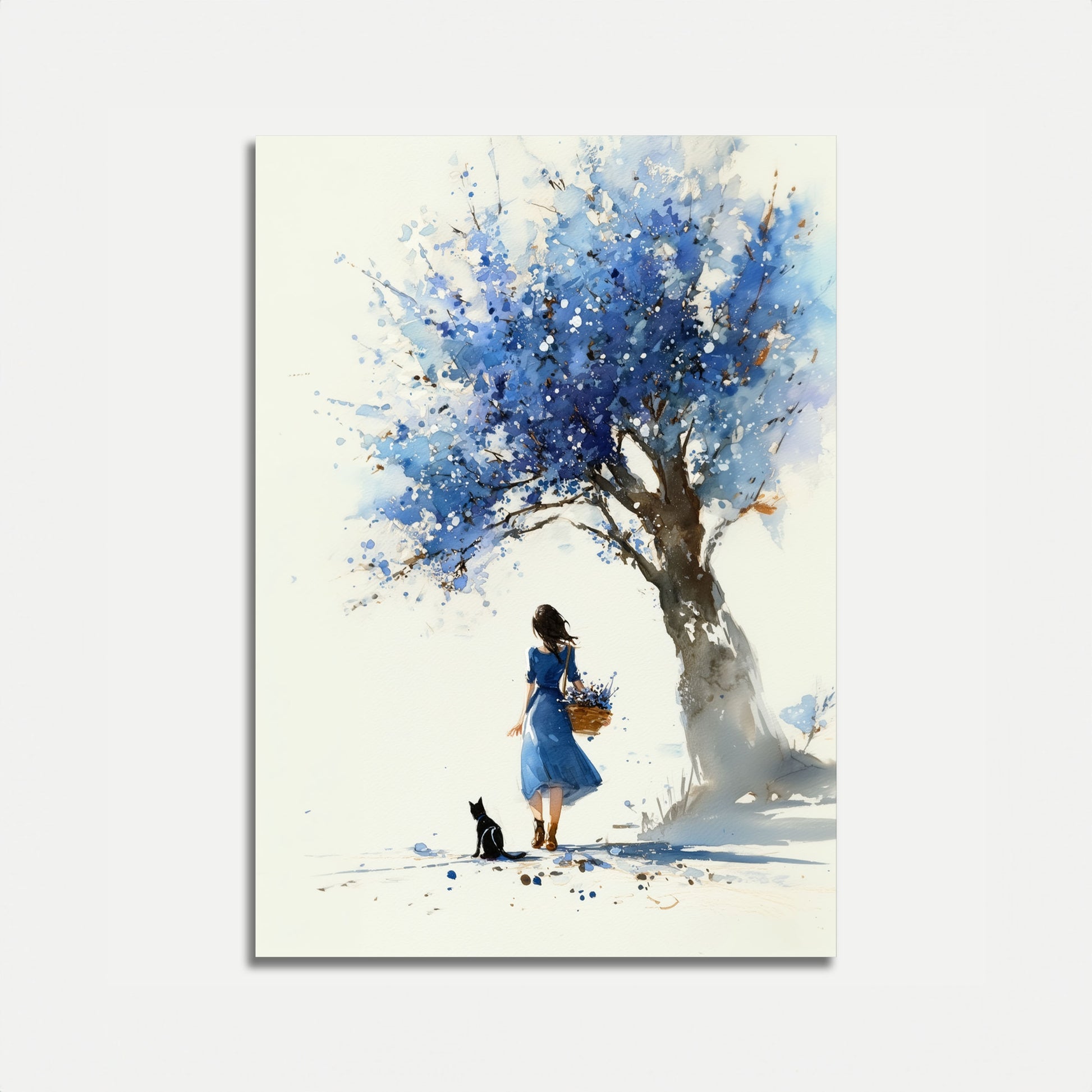 Ta urzekająca akwarela uchwycza spokojną chwilę dziewczyny stojącej pod wspaniałym drzewem pełnym błyszczących niebieskich kwiatów. Delikatna gra miękkiego rozmycia i żywych plam tworzy marzycielską, mistyczną atmosferę, która wydaje się zarówno pokojowa, jak i magiczna. Wraz z wiernym czarnym kotem u jej stóp i trzymającą koszyk złotych kwiatów, ten obraz budzi uczucia zdumienia, samotności i prostej urody ukrytej w cichych chwilach natury. Mistrzowskie użycie przez artystę błękitów, bieli i stonowanych tonów ziemi wprowadza cię w świat kontemplacji i wdzięku, czyniąc to doskonałym uzupełnieniem każdej przestrzeni szukającej spokoju i artystycznej inspiracji.