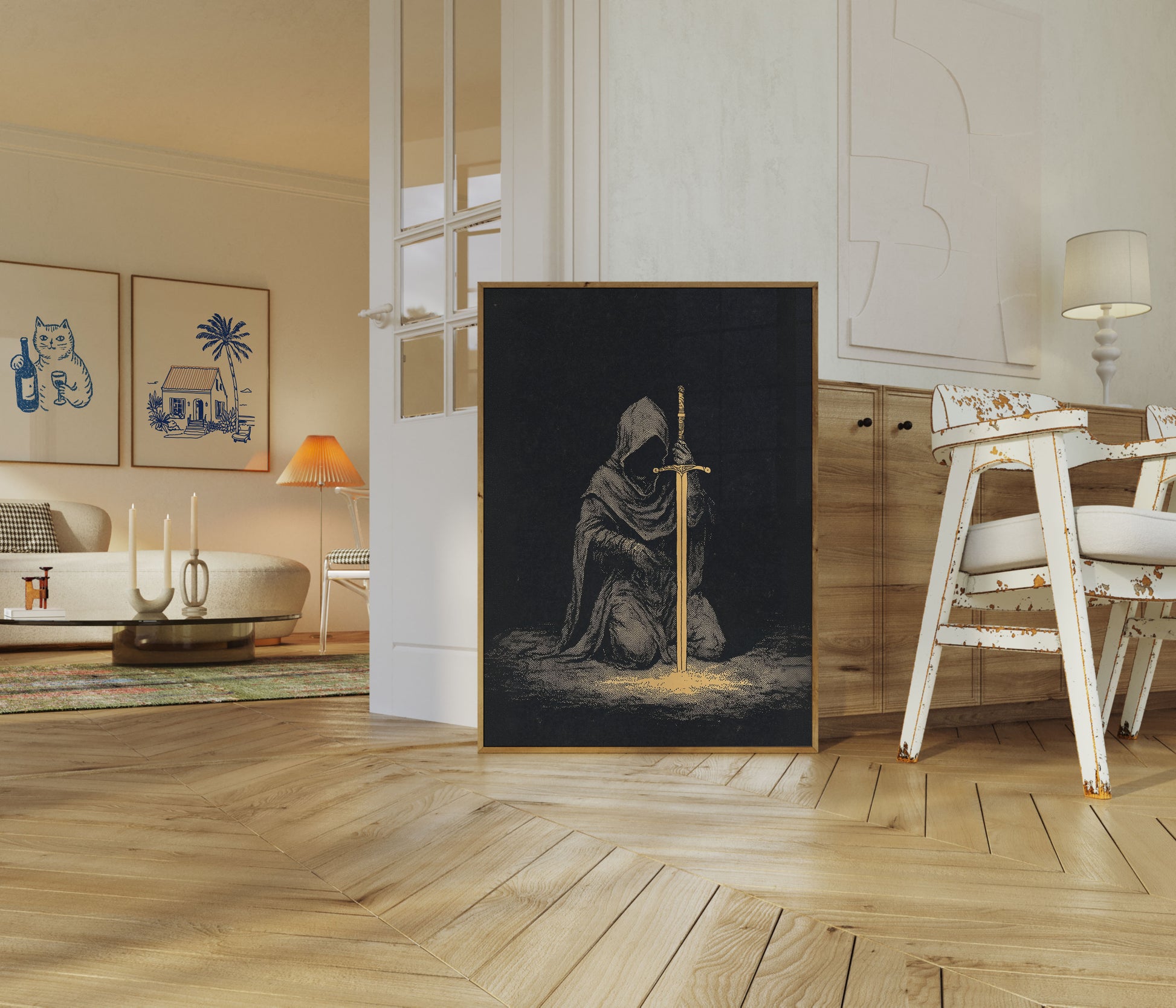 Ta uderzająca ilustracja uchwycila istotę średniowiecznego heroizmu z rycerzem w kapturze klęczącym przed ozdobnym złotym mieczem. Dramatyczny kontrast między skomplikowaną postacią ze skrzyżowanymi liniami a jaśniejącym mieczem tworzy potężne poczucie honoru i celu. Ciemne, pełne atmosfery tło podkreśla symboliczną wagę tego momentu, przywołując motywy rycerskości, odwagi i szlachetnego zaangażowania, które resonują przez wieki.