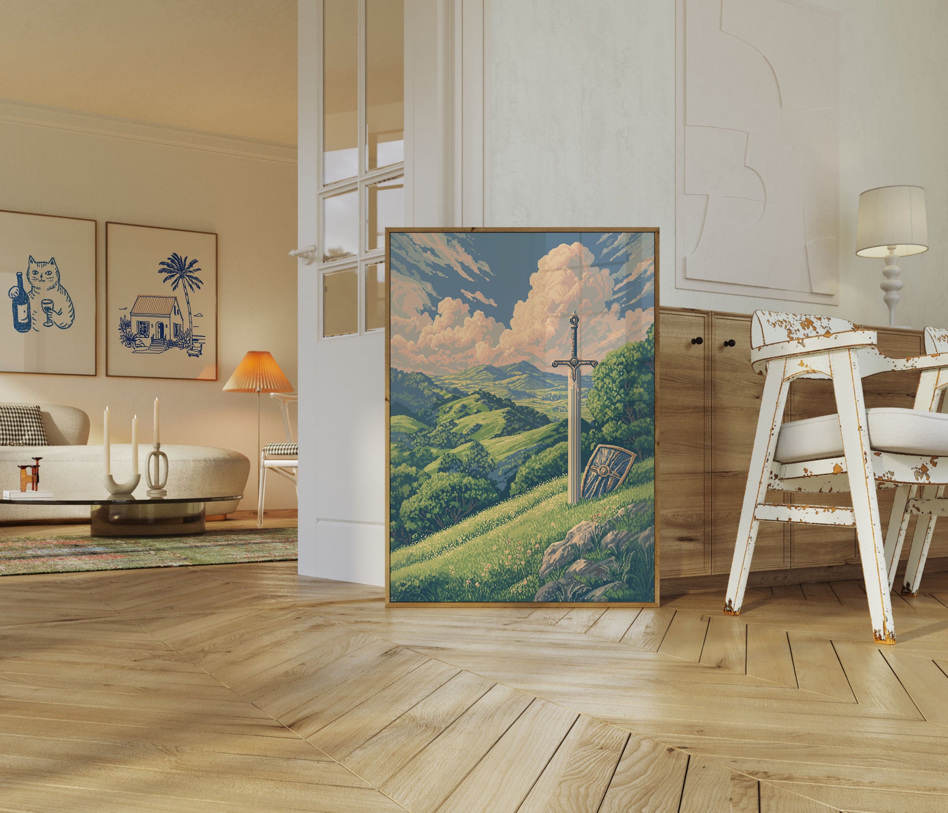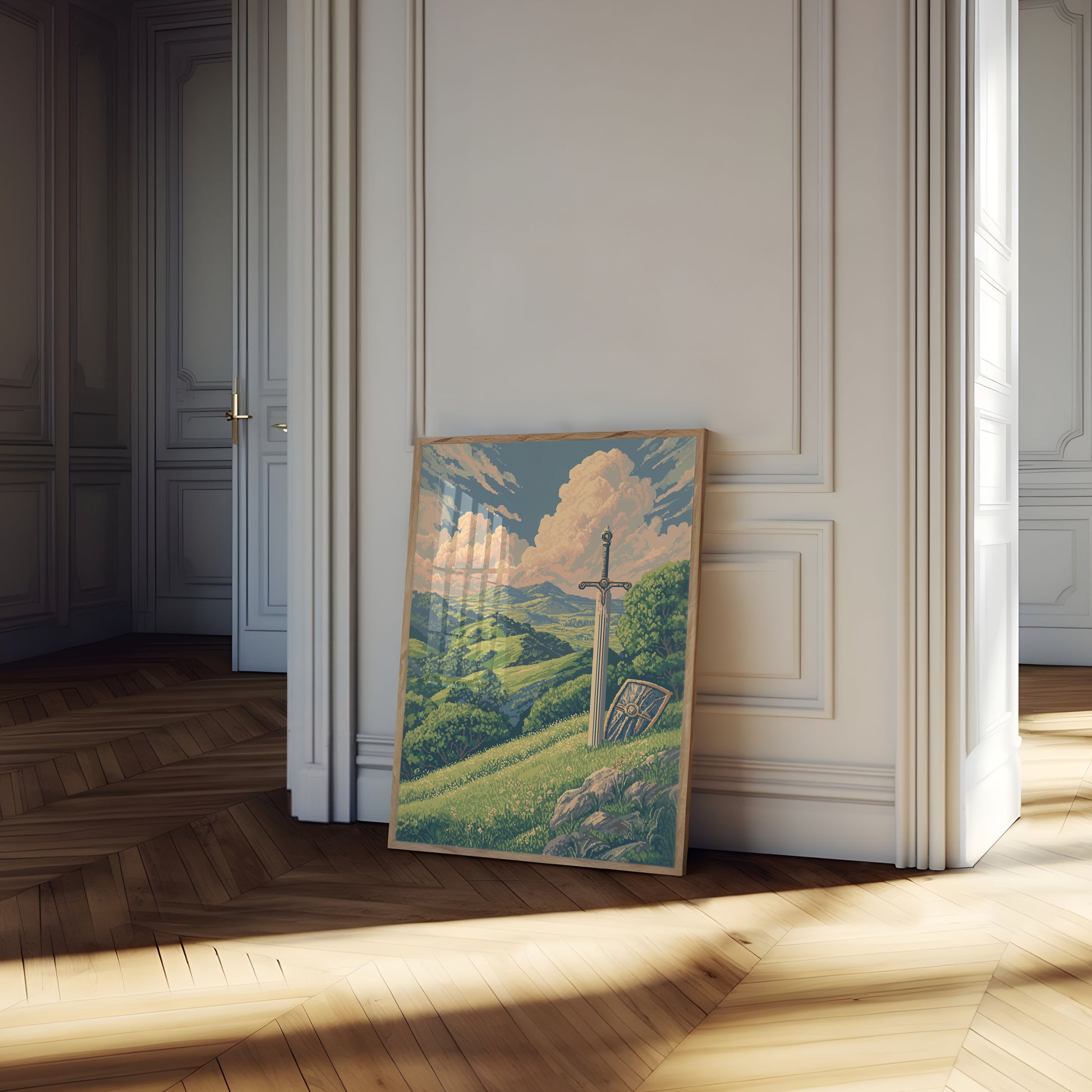 Ta oszałamiająca ilustracja w stylu vintage przedstawia szlachetny miecz zasiedziony na bujnym, falującym wzgórzu, dominujące nad zapierającą dech w piersiach pastoralną doliną. Delikatna paleta barw kremowych, szałwiowego zieleni i pył niebieskiego tworzy spokojną, lecz potężną atmosferę, przywołującą tematy rycerstwa, przygody i ponadczasowej waleczności. Wyniosłe chmury dryfują majestatycznie po niebie, podczas gdy bujne lasy punktują krajobraz, łącząc fantazję i historyczny romans w jedną pasjonującą scenę, która przenosi widzów w świat średniowiecznych legend i bohaterskich poszukiwań.