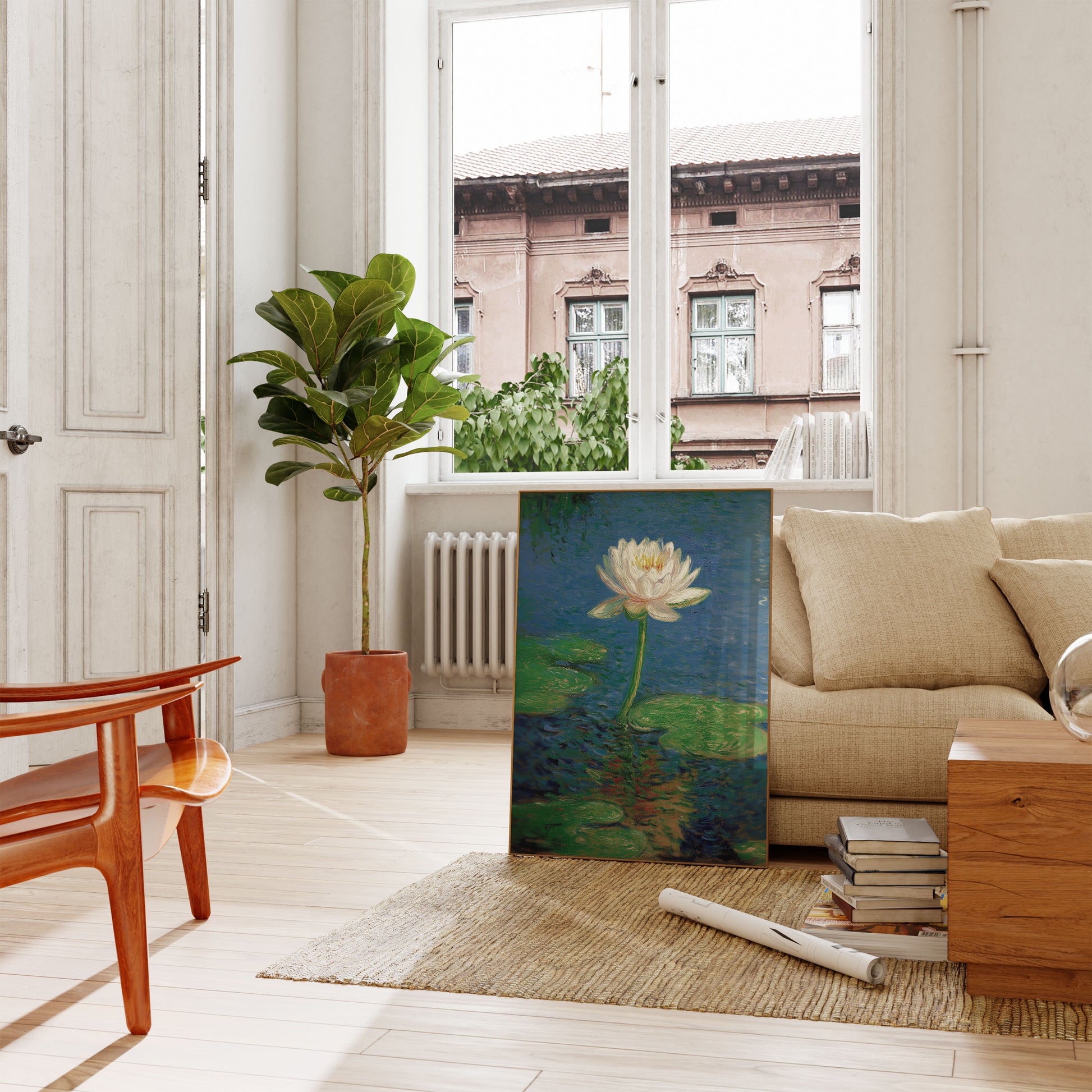 To oszałamiające artystyczne dzieło przedstawiające delikatne piękno białej nenuparu w pełnym rozkwicie, gracefully unoszącego się na spokojnych błękitnych wodach. Obraz prezentuje doskonałe pędzlowanie z jaśniejącymi białymi płatkami i złotym środkiem, otoczonym bujnymi zielonymi liśćmi lotosu, które tworzą spokojną, medytacyjną atmosferę. Miękka paleta barw złożona z błękitów, zieleni i kremów budzi poczucie spokoju i naturalnej elegancji, czyniąc to dzieło idealnym dodatkiem do każdej przestrzeni poszukującej spokoju i botanicznego uroku.
