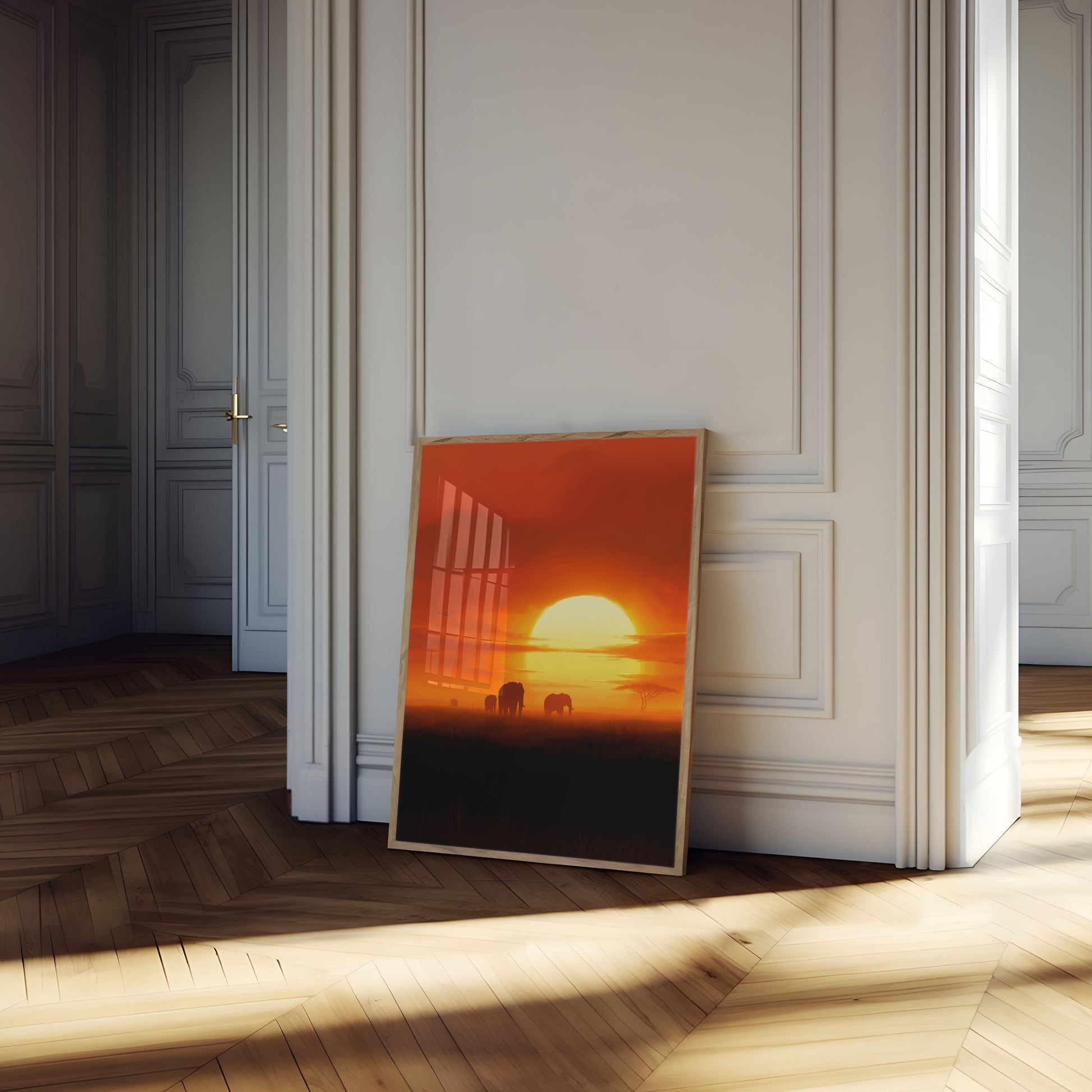 A breathtaking landscape capturing a herd of elephants silhouetted against a blazing orange and yellow sunset. The massive sun dominates the sky, casting a warm golden glow across the African savanna, with gentle grasslands and an acacia tree in the distance. This stunning image embodies the raw beauty and serenity of wildlife in their natural habitat.