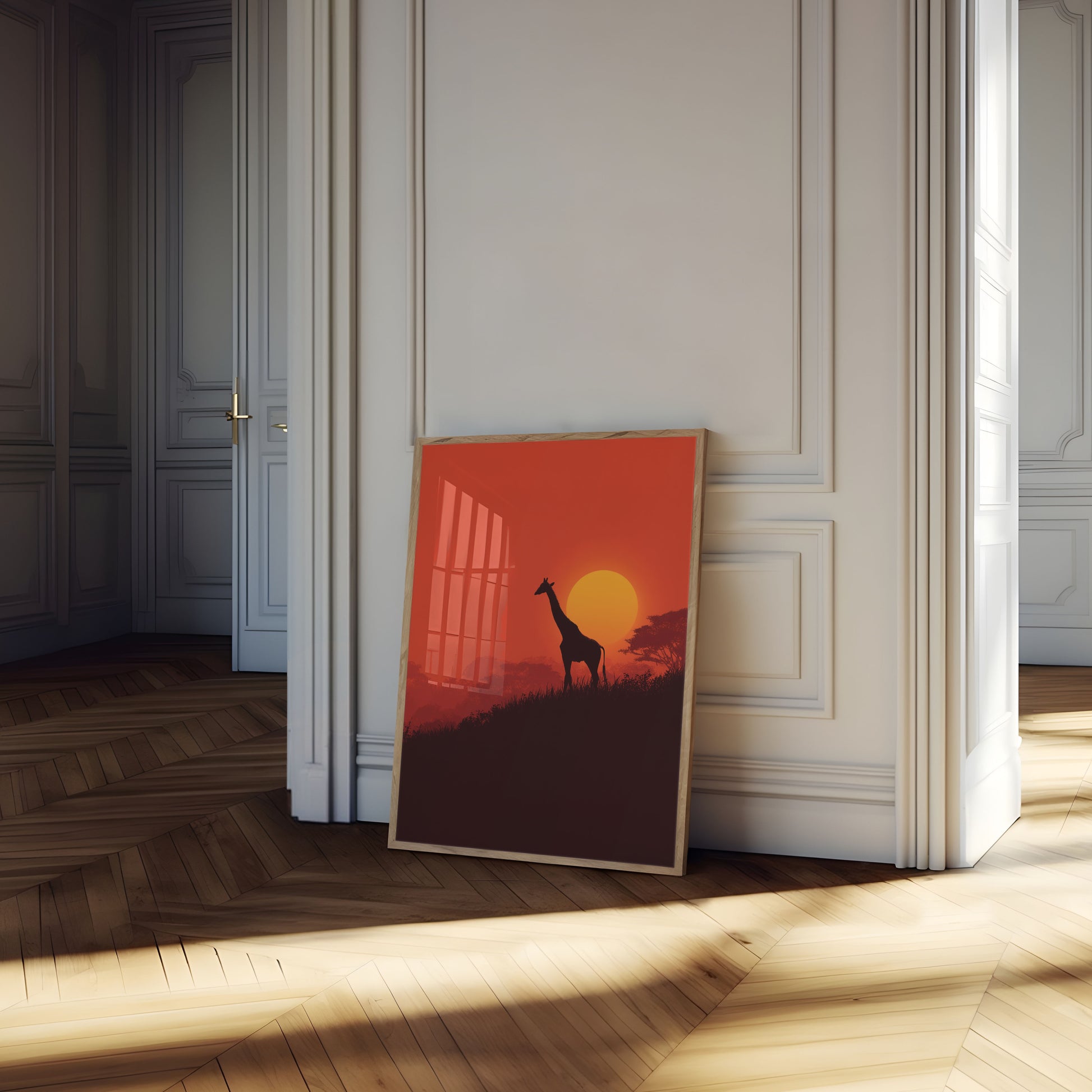 Experience the breathtaking beauty of the African savanna with this stunning sunset scene. A solitary giraffe stands majestically against a fiery orange sky, creating a powerful silhouette that captures the raw essence of wildlife and wilderness. The dramatic landscape showcases the profound tranquility and untamed spirit of the African plains at dusk.