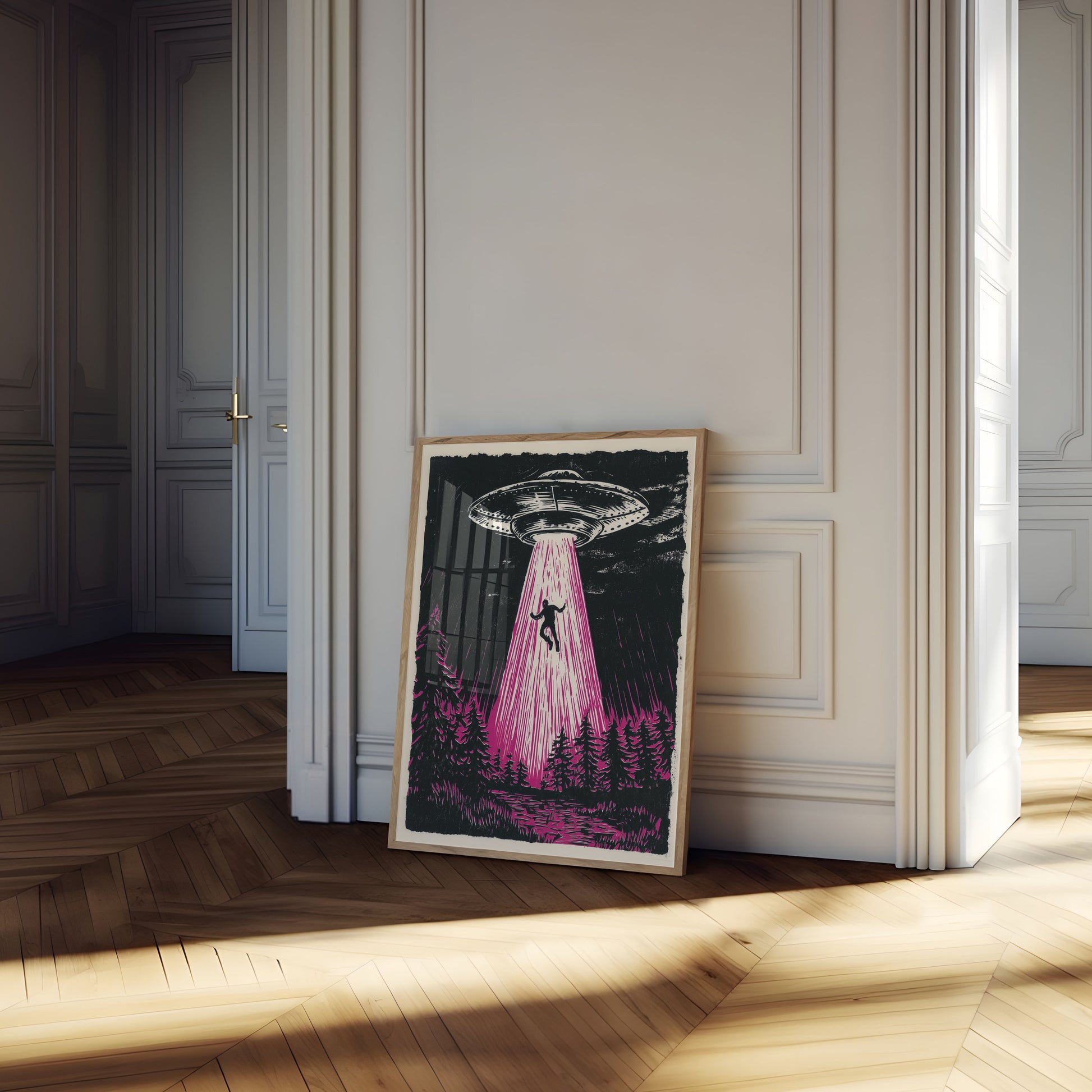 A stunning graphic art print depicting a classic UFO encounter in a mysterious forest landscape. Vibrant magenta and deep black tones create an electrifying scene of a silhouetted figure being lifted into a hovering spacecraft's intense beam. The dramatic illustration captures the otherworldly tension of an unexpected extraterrestrial intervention.