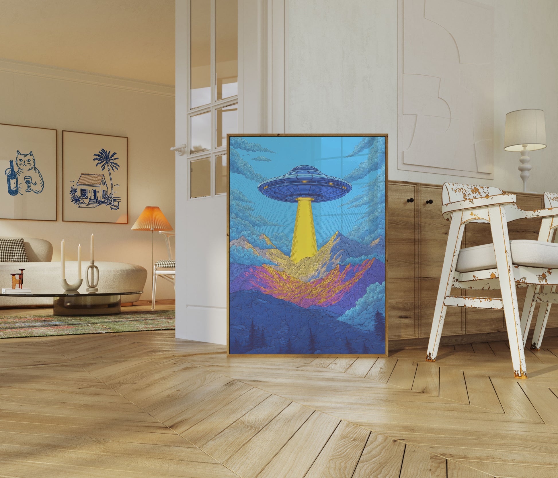 A mesmerizing illustration captures a classic UFO hovering over a surreal mountain landscape. Vibrant blues and yellows create an ethereal scene of extraterrestrial mystery, with a gleaming flying saucer casting its supernatural yellow beam onto the rugged terrain below. The intricate line work and dreamlike color palette transform an alien encounter into a stunning work of art.