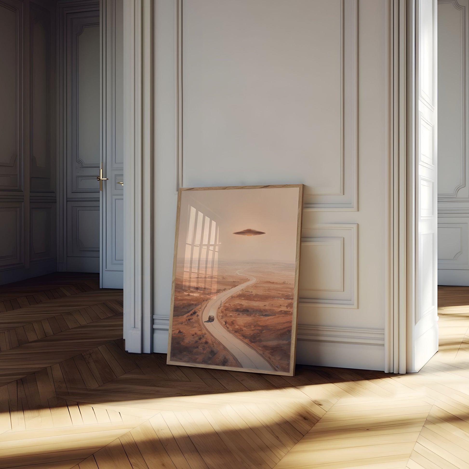 A mesmerizing watercolor artwork depicting a classic UFO hovering above a lonely desert highway. Soft terracotta and sepia tones create an ethereal atmosphere of mystery and anticipation, with a solitary vehicle winding through the barren landscape beneath an enigmatic spacecraft. The painting captures the quintessential sci-fi imagery of unexpected extraterrestrial encounters in a vast, isolated wilderness.