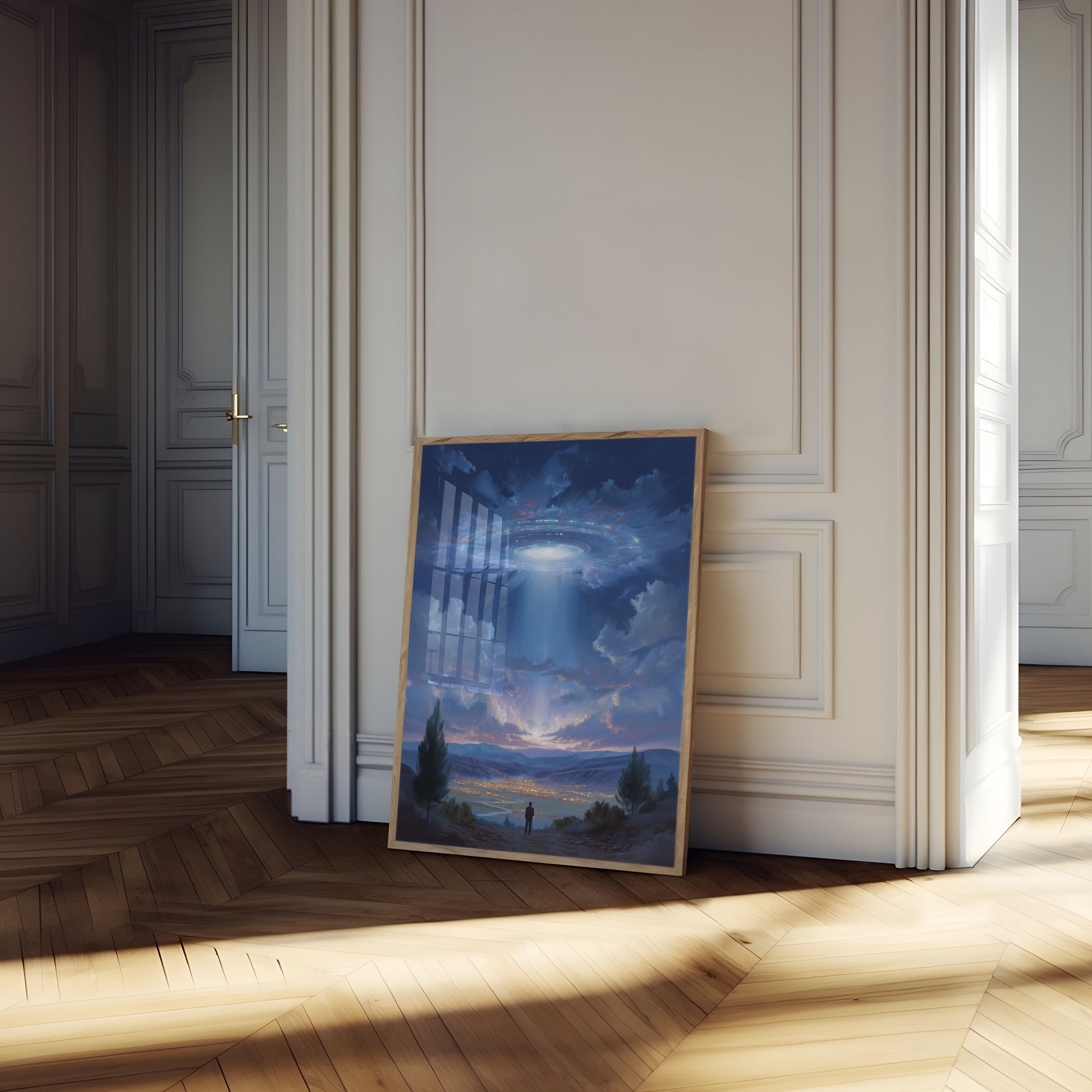 A breathtaking scene of an enormous UFO hovering over a tranquil mountain valley, casting an ethereal blue light through dramatic cloudscapes. The massive spacecraft dominates the night sky, its intricate circular design illuminated against swirling clouds, while a solitary figure stands witness to this extraordinary moment of cosmic contact. Mysterious and awe-inspiring, this poster captures the imagination of anyone fascinated by extraterrestrial possibilities.