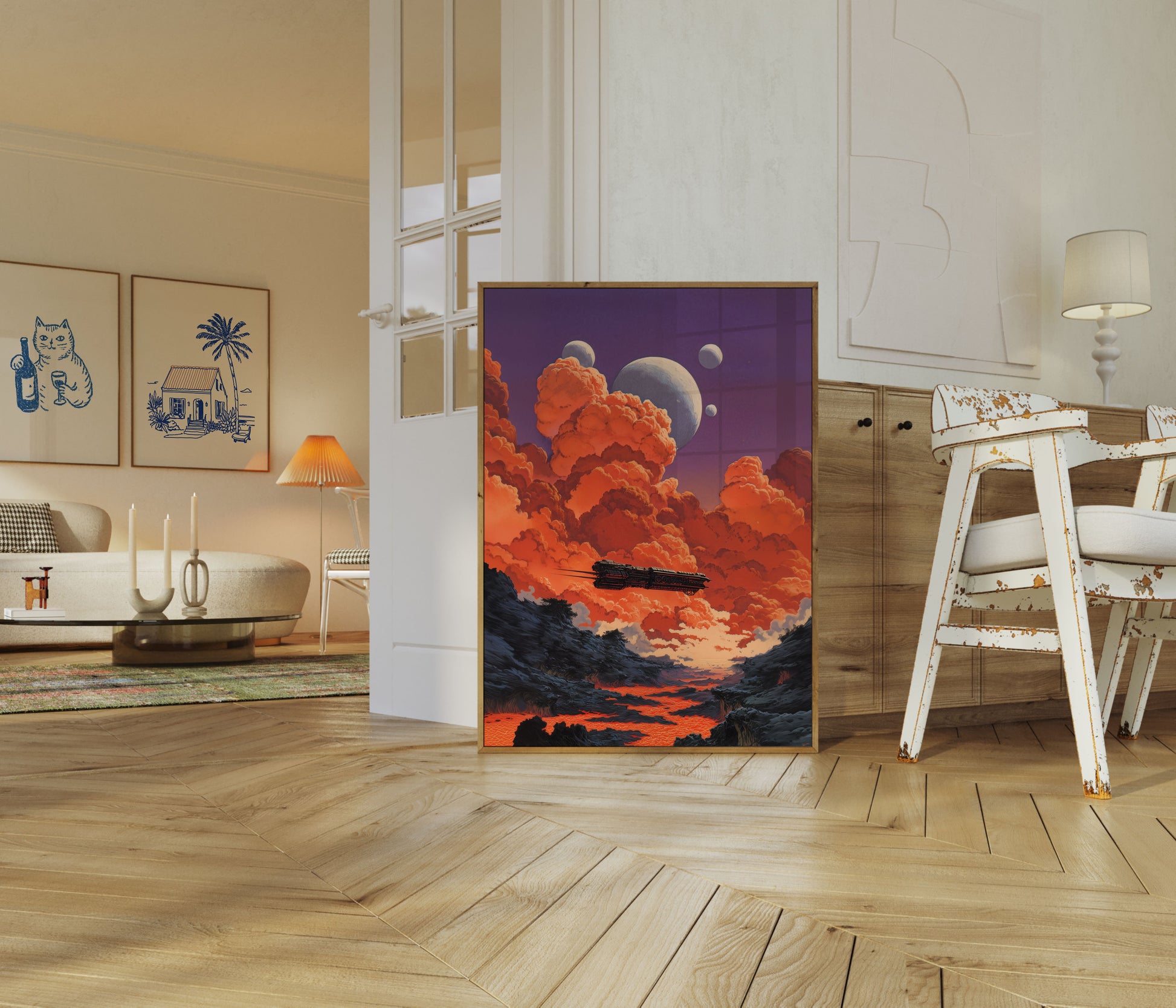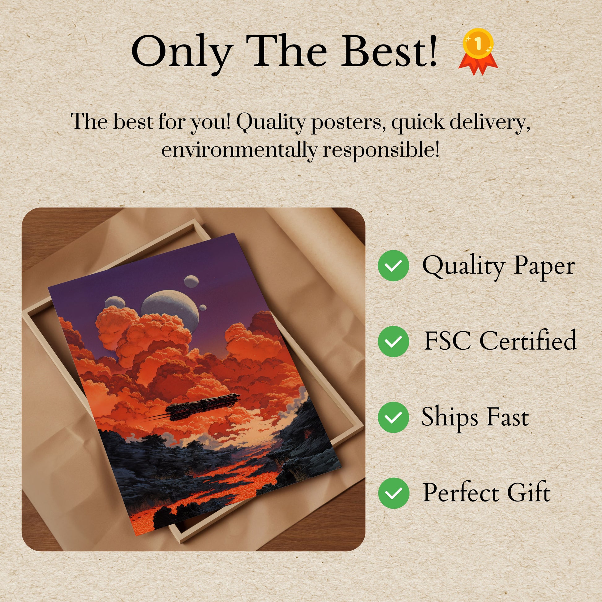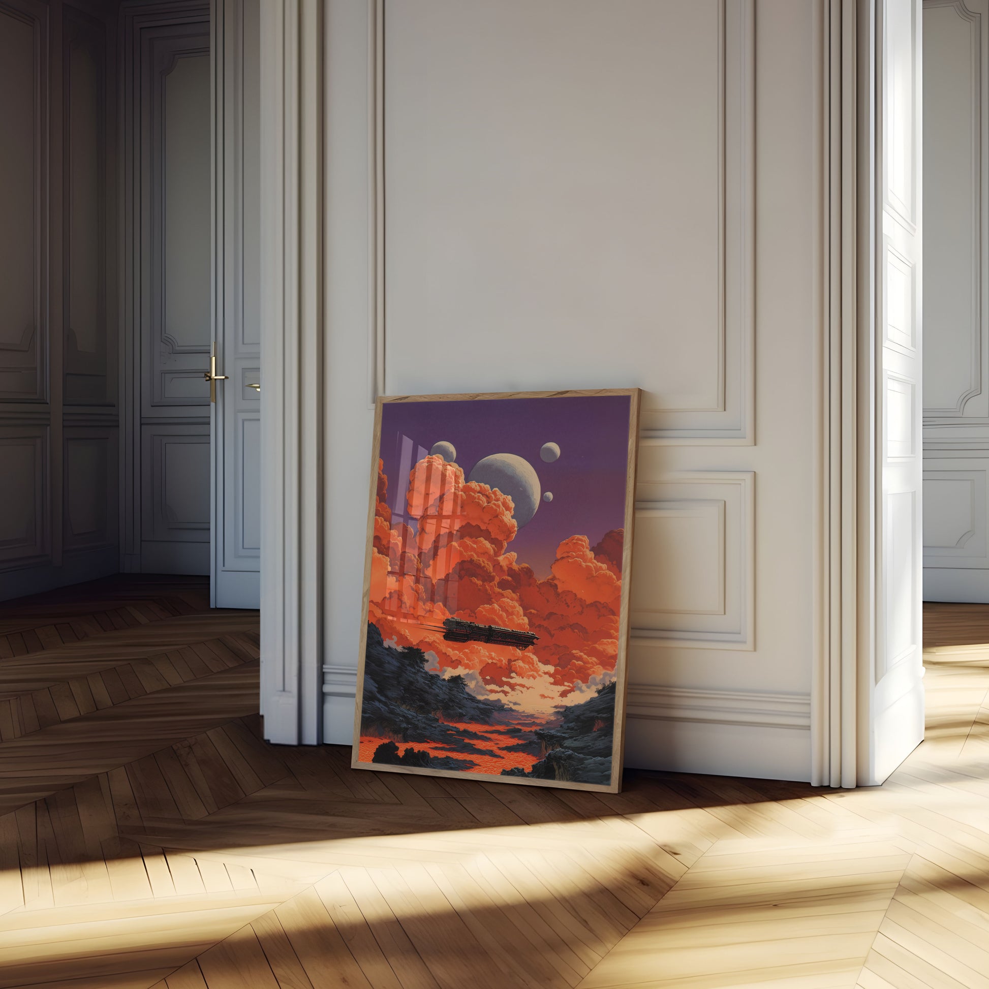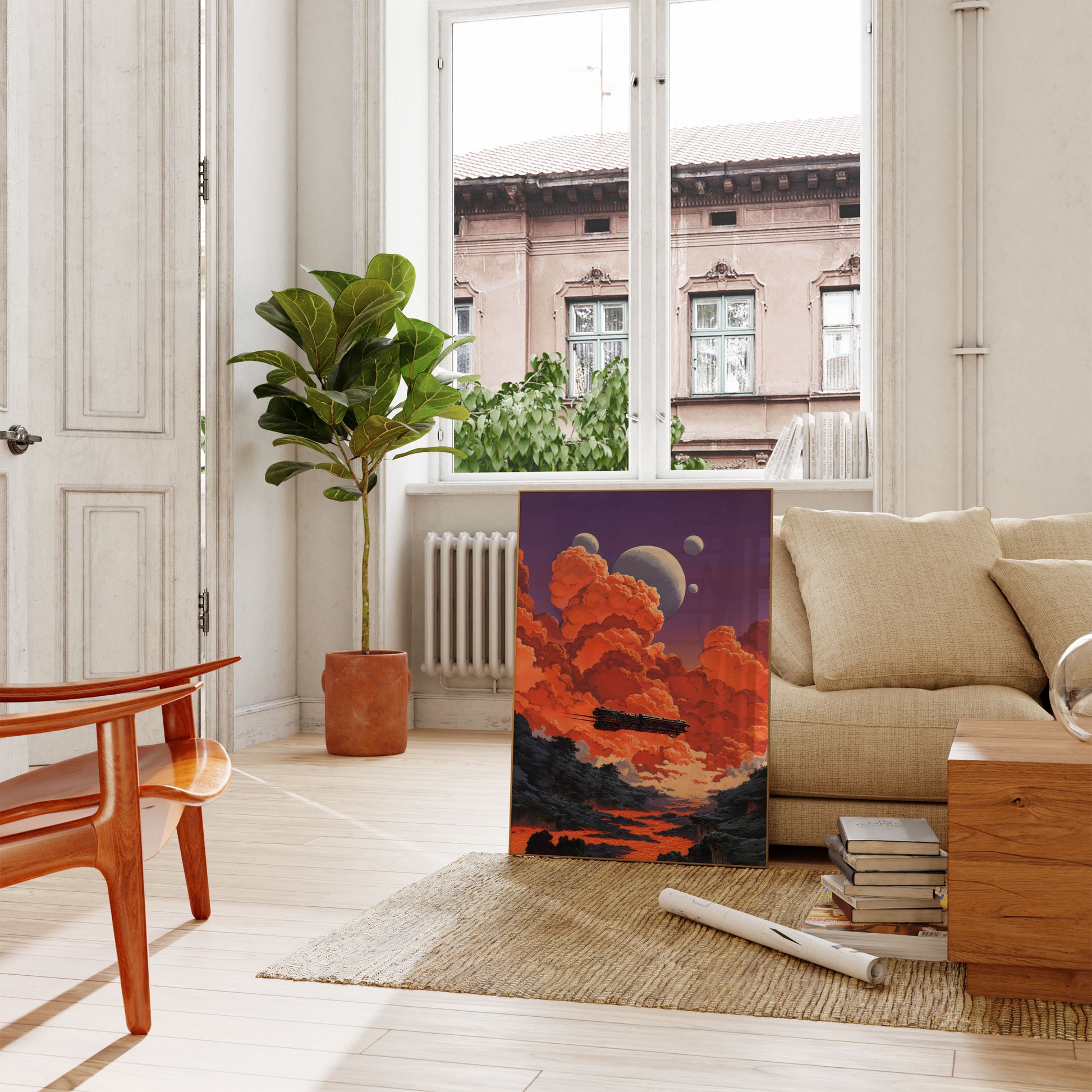 Escape to a breathtaking alien world with this stunning sci-fi landscape poster. A sleek spacecraft glides through towering crimson clouds while multiple moons hang mysteriously in a deep purple sky, creating an atmosphere of cosmic wonder and adventure. The dramatic contrast between the vibrant orange cloud formations and the cool violet heavens draws you into a realm of imagination, perfect for dreamers, space enthusiasts, and anyone who loves otherworldly art that sparks the imagination.