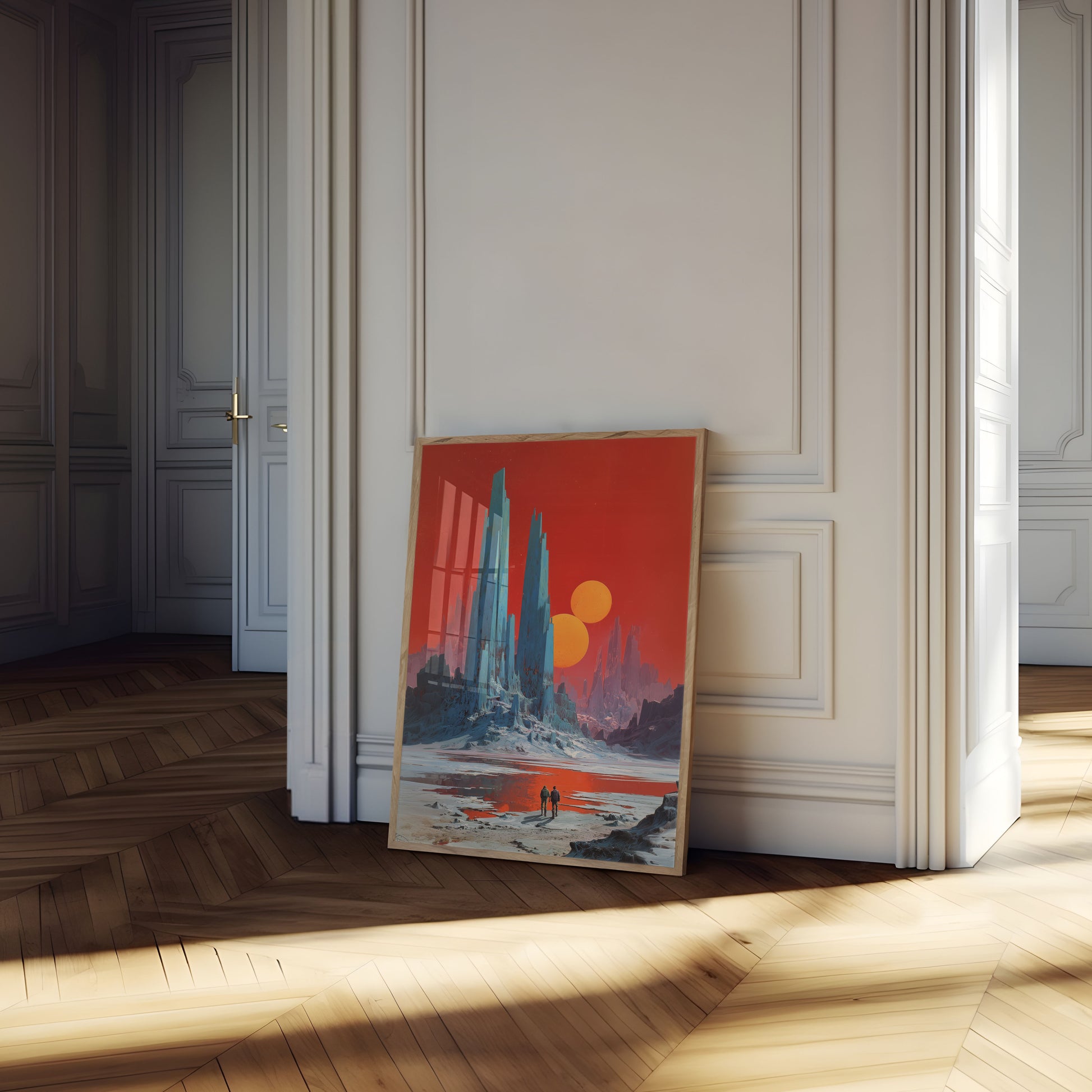 Step into a breathtaking sci-fi landscape with this stunning alien world artwork. Two glowing orange suns hang majestically in a crimson sky, casting an otherworldly glow over towering crystalline ice structures that pierce the frozen terrain below. The dramatic contrast between the cool blue-tinted architecture, the warm amber celestial bodies, and the rich red atmosphere creates an immersive and haunting mood that captures the essence of distant exploration and extraterrestrial wonder. This is perfect for anyone who loves science fiction, space exploration, and surreal fantasy worlds.