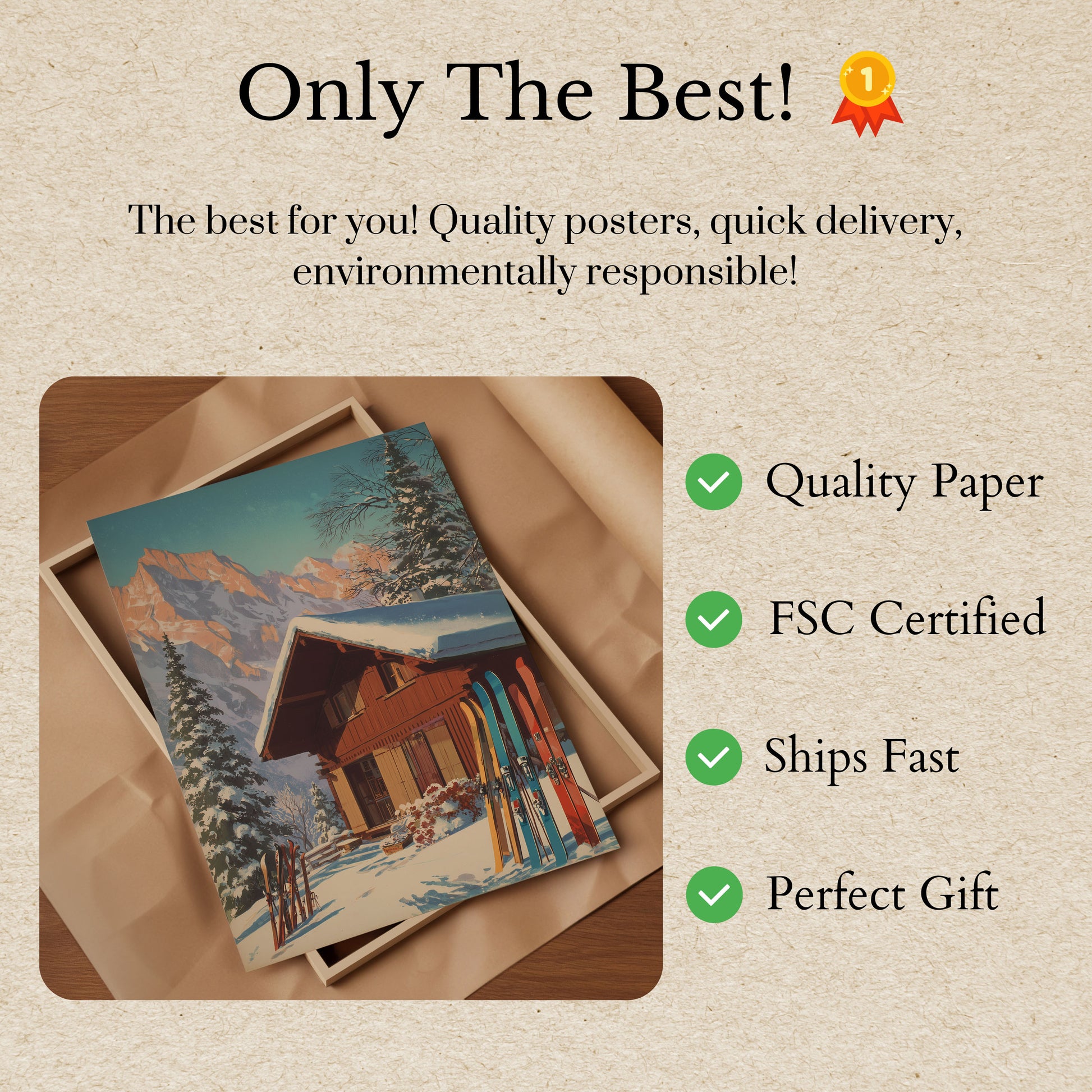 Immerse yourself in the serene winter beauty of this stunning alpine ski cabin poster. Majestic snow-capped mountains rise behind a rustic wooden chalet, with vibrant skis standing ready in the pristine snow. The warm oranges and cool blues create a breathtaking winter scene that captures the essence of mountain tranquility.