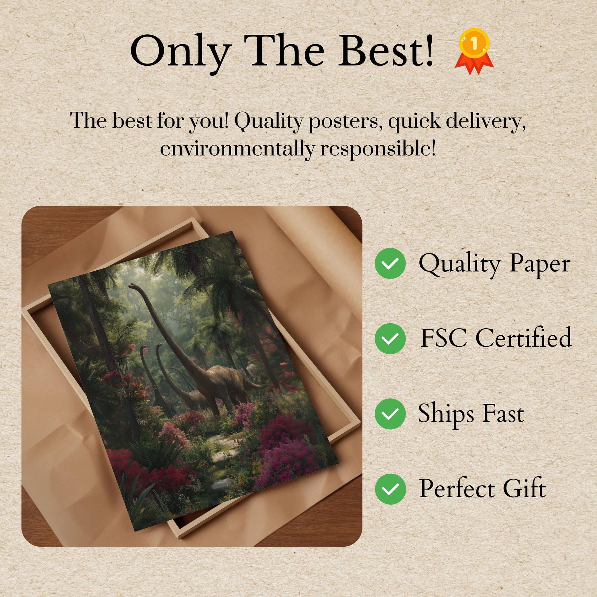 Step into a lush prehistoric world where long-necked brachiosaurus roam through a vibrant, misty jungle landscape. Towering palm trees and brilliant pink and red flowering plants create a dreamlike scene of prehistoric tranquility, with gentle giants moving softly through the verdant environment. This stunning artwork captures the mysterious and serene world of dinosaurs in breathtaking detail.
