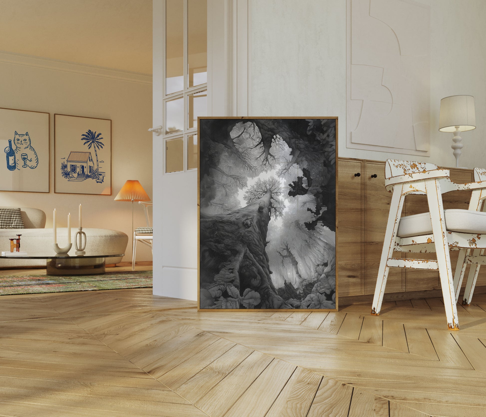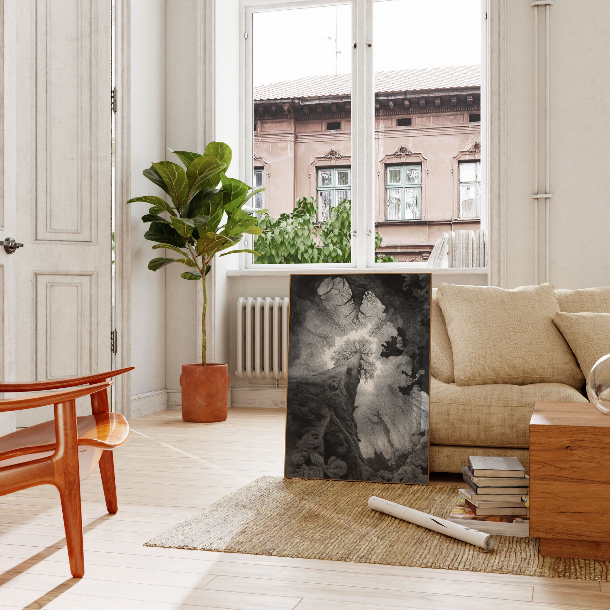 This mesmerizing black and white illustration captures the majestic essence of an ancient forest, viewed from the ground looking upward. Intricate, textured lines create a stunning visual of towering trees with sprawling branches that reach toward a bright, ethereal sky. The artwork beautifully illustrates the interconnectedness and profound depth of a primeval woodland, with each tree rendered in exquisite detail.