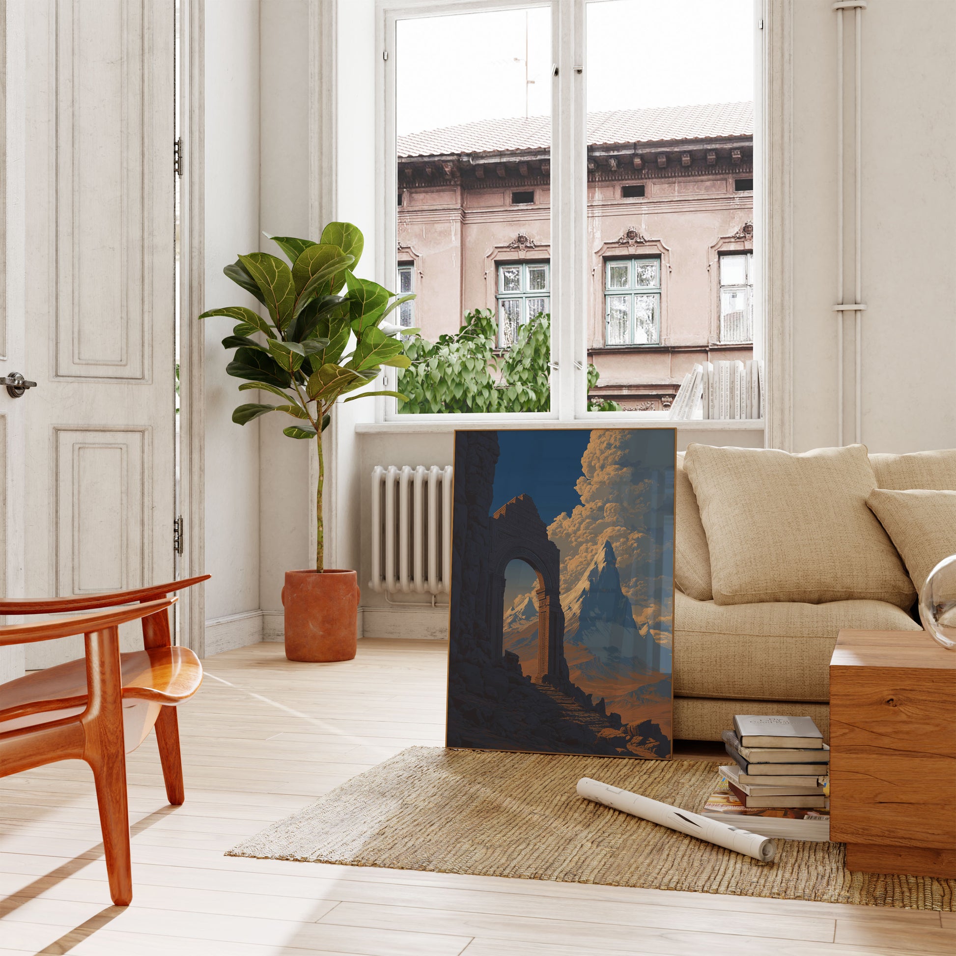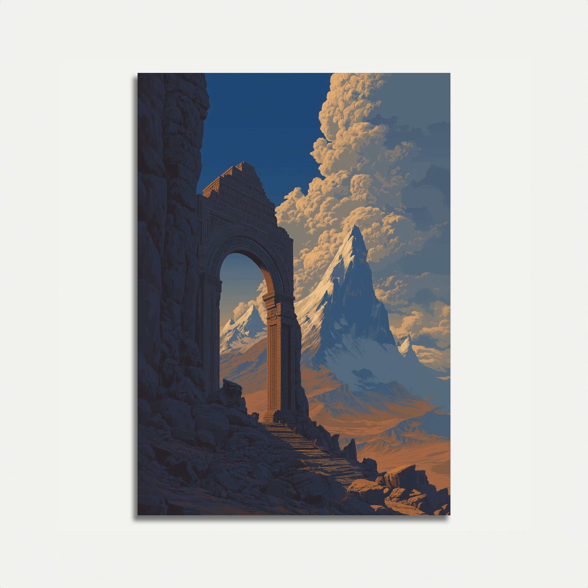 A breathtaking landscape unveils an ornate stone archway perched on rocky terrain, leading to majestic snow-capped mountains bathed in golden light. Dramatic billowing clouds frame the scene, creating an ethereal passage between rugged earth and celestial sky. The intricate architectural portal seems to invite viewers into a realm of timeless mystery and epic exploration.