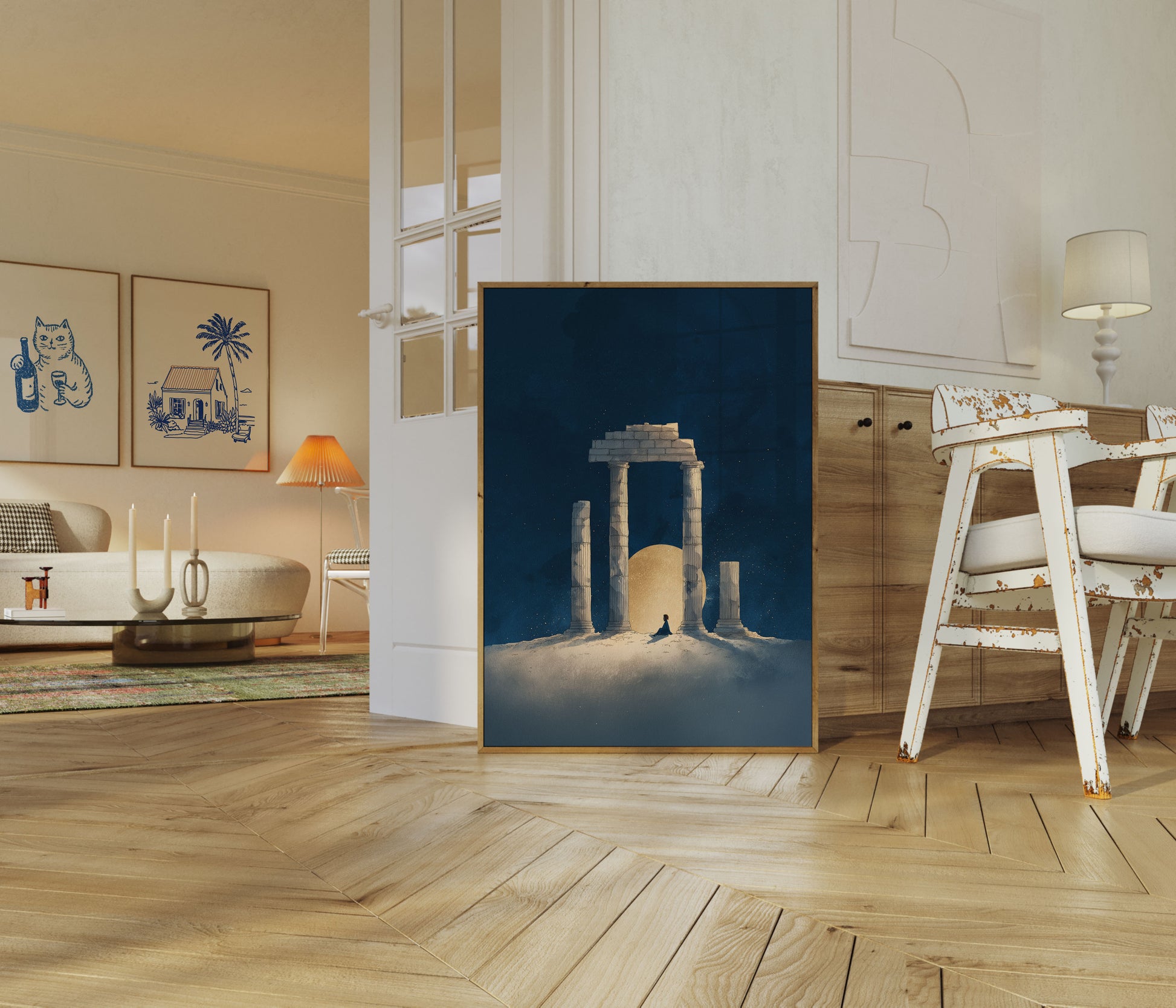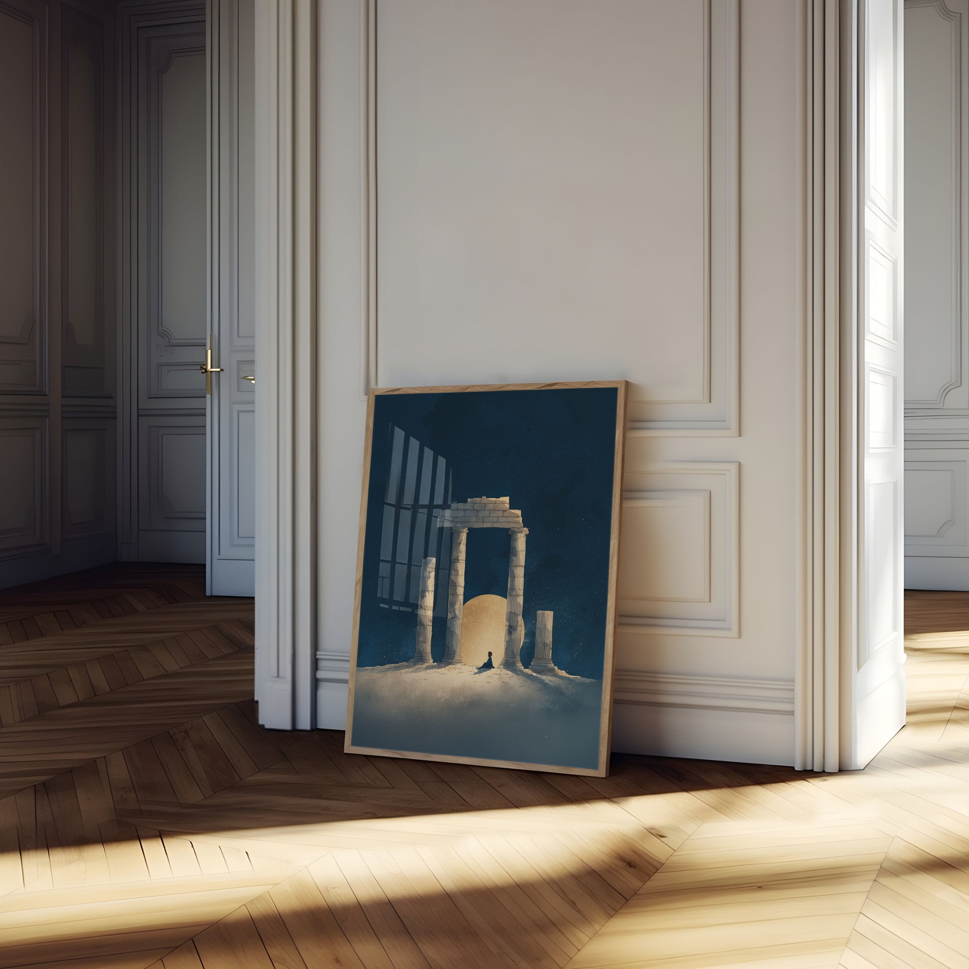 A mesmerizing nighttime scene captures an ancient Greek or Roman temple silhouetted against a luminous golden moon. Delicate columns rise from a misty landscape, with a solitary figure seated in quiet contemplation beneath the starry sky. The artwork blends architectural grandeur with a sense of profound solitude and cosmic wonder.