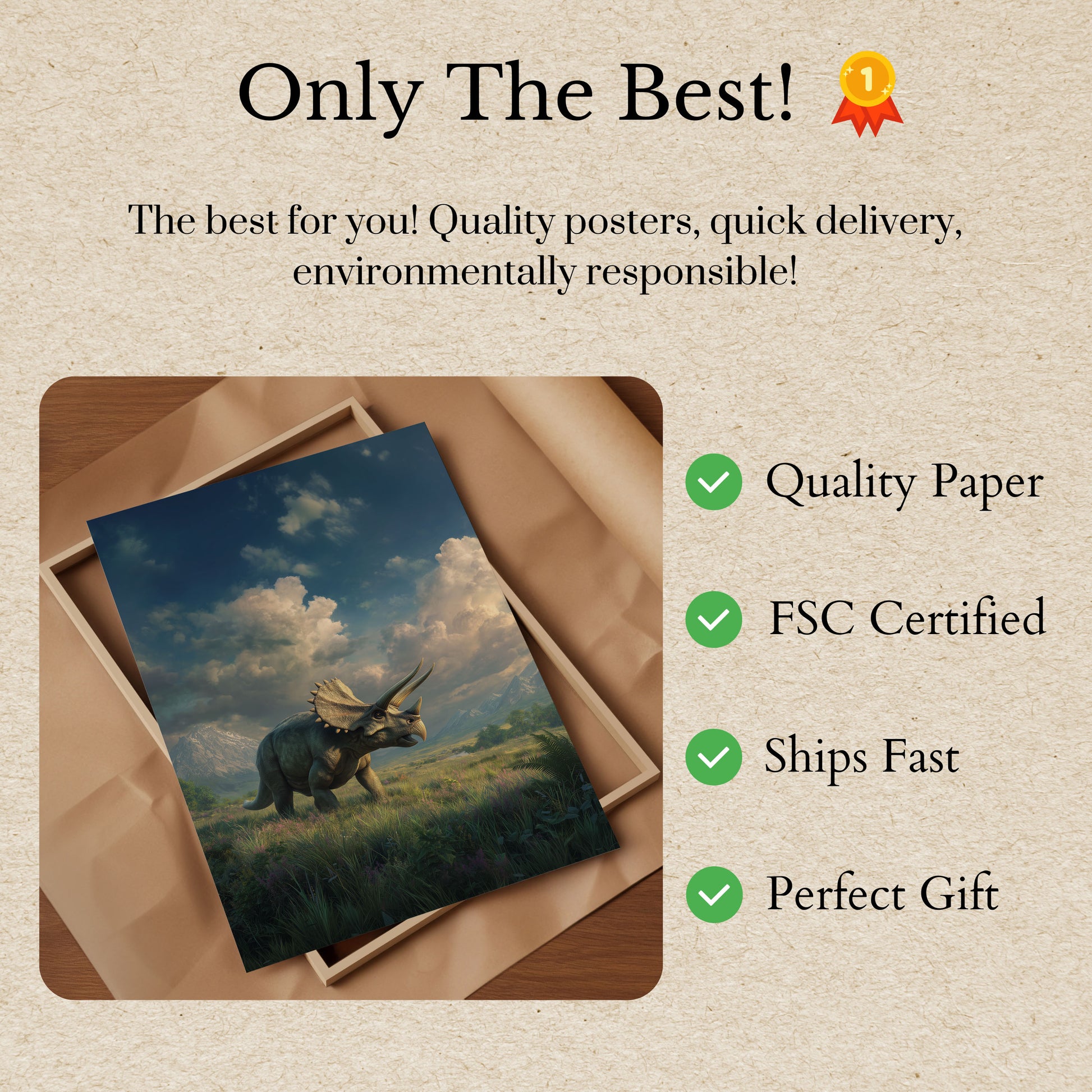 Step into a prehistoric world with this breathtaking illustration of a majestic triceratops roaming a lush grassland beneath dramatic cloudy skies. The detailed dinosaur stands prominently in a vibrant meadow, with snow-capped mountain peaks rising in the background, creating a stunning scene that captures the raw beauty and mystery of Earth's distant past. Rich textures, soft lighting, and an expansive landscape bring this prehistoric moment to life with incredible realism and emotional depth.