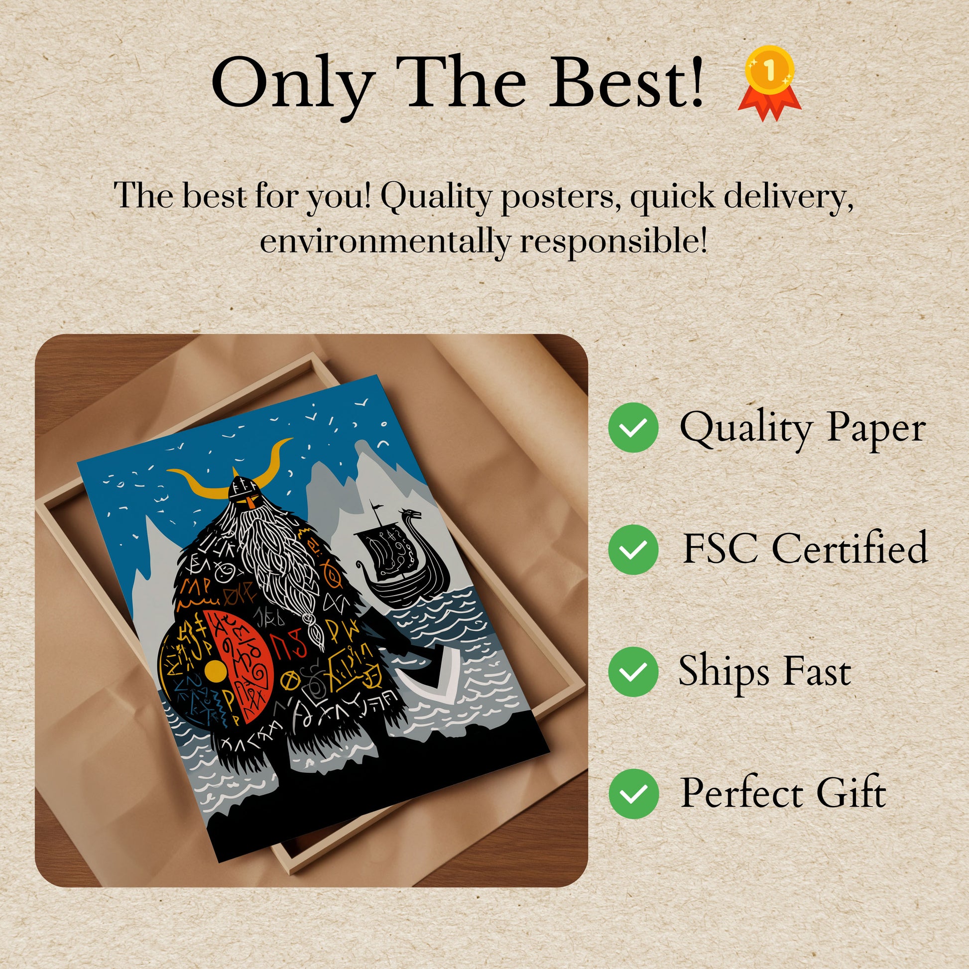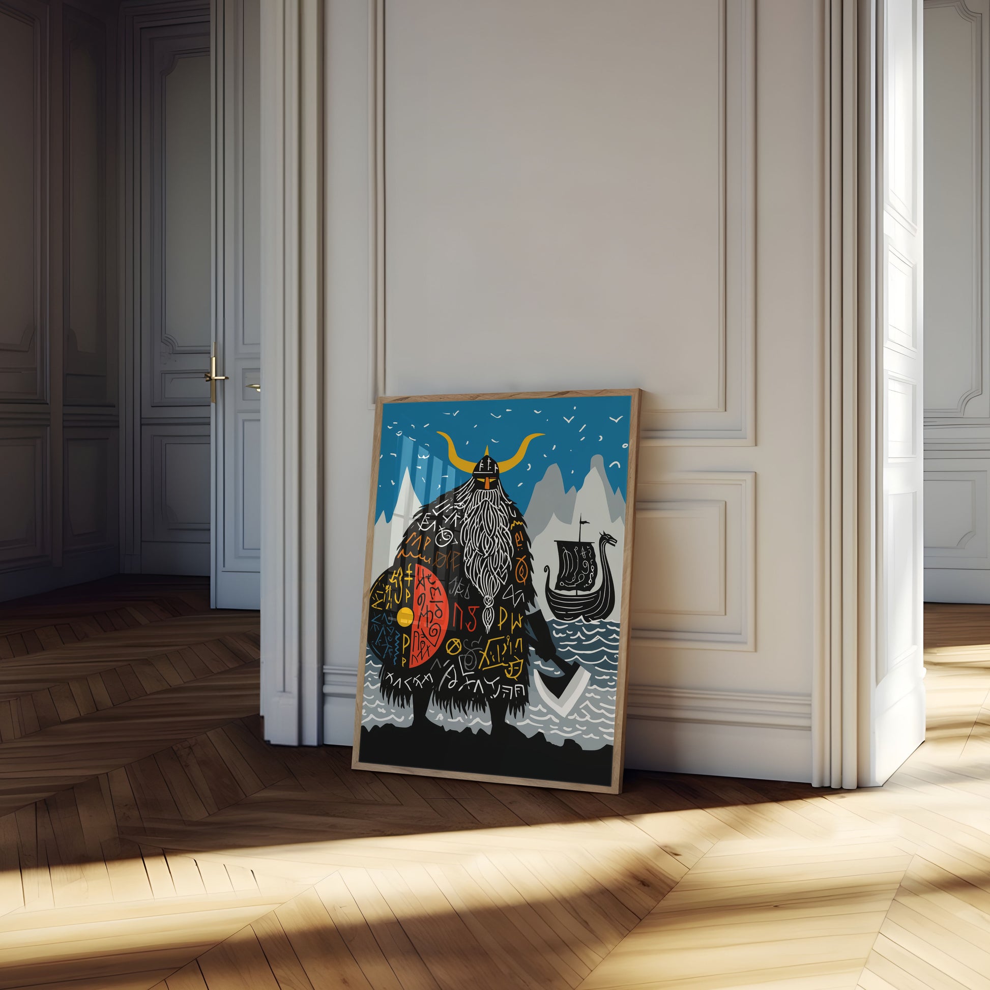 Dive into a mystical Norse world with this captivating Viking illustration. The powerful figure stands adorned with intricate runic symbols, wearing a horned helmet and surrounded by a dramatic mountainous seascape. A traditional Viking longship floats nearby, completing this epic Nordic narrative.