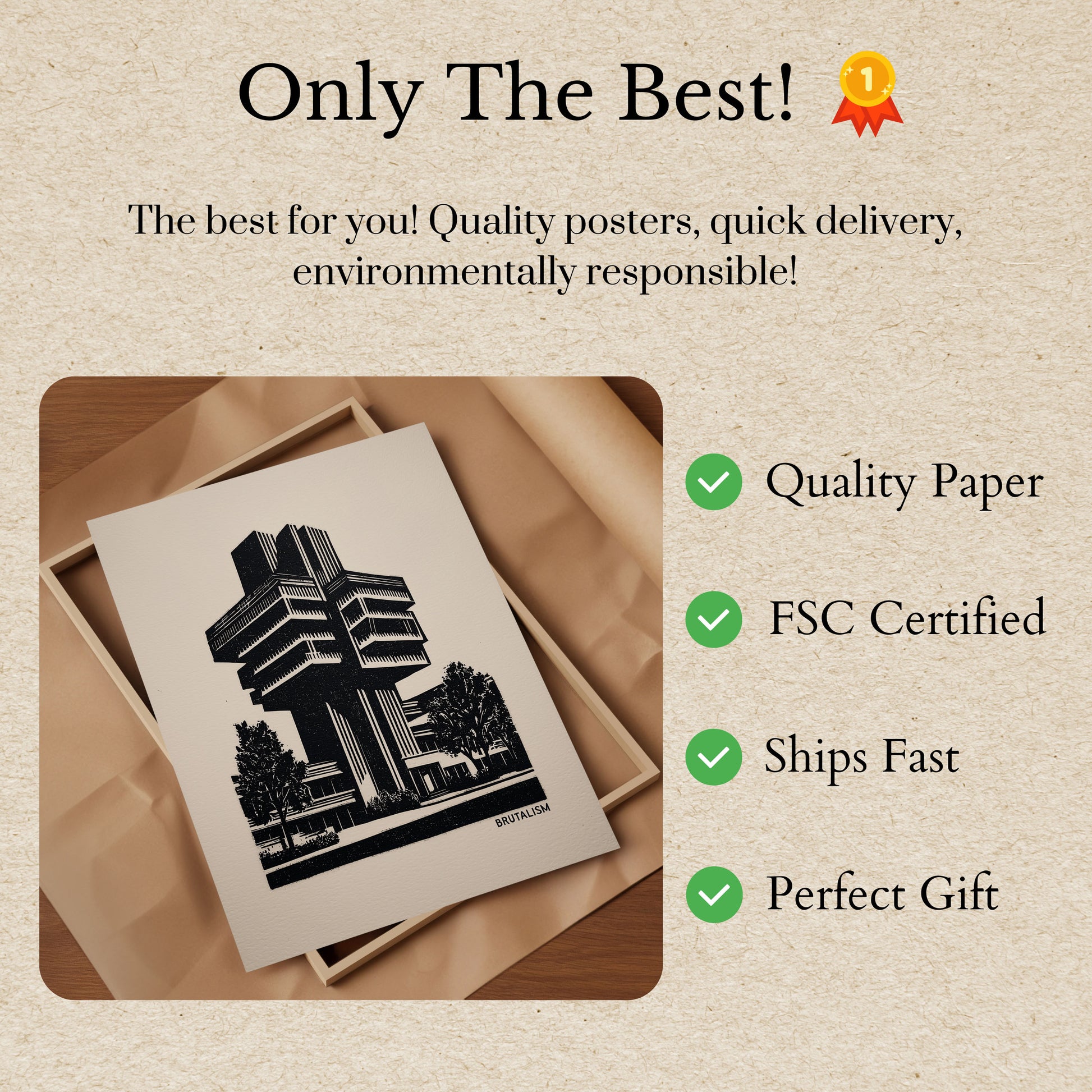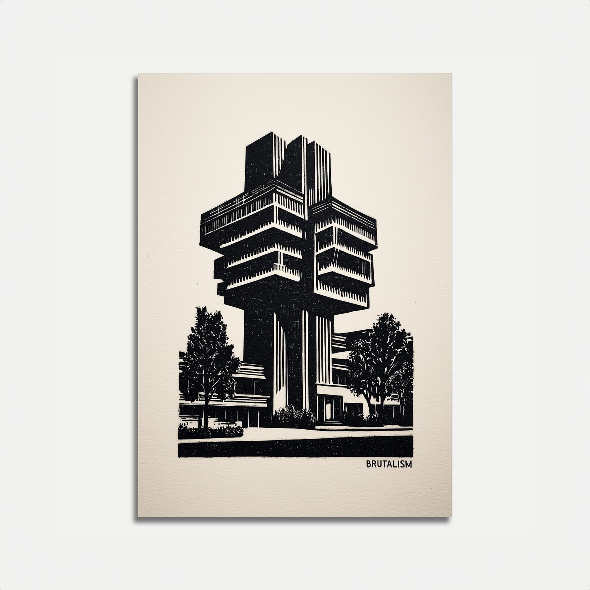Explore the raw, powerful essence of Brutalist architecture with this striking black and white illustration. The bold geometric design captures the dramatic angular structure of a monumental building, featuring stacked concrete levels and vertical columns set against minimalist trees. This poster celebrates the uncompromising aesthetic of Brutalism, showcasing its sculptural form and architectural integrity.