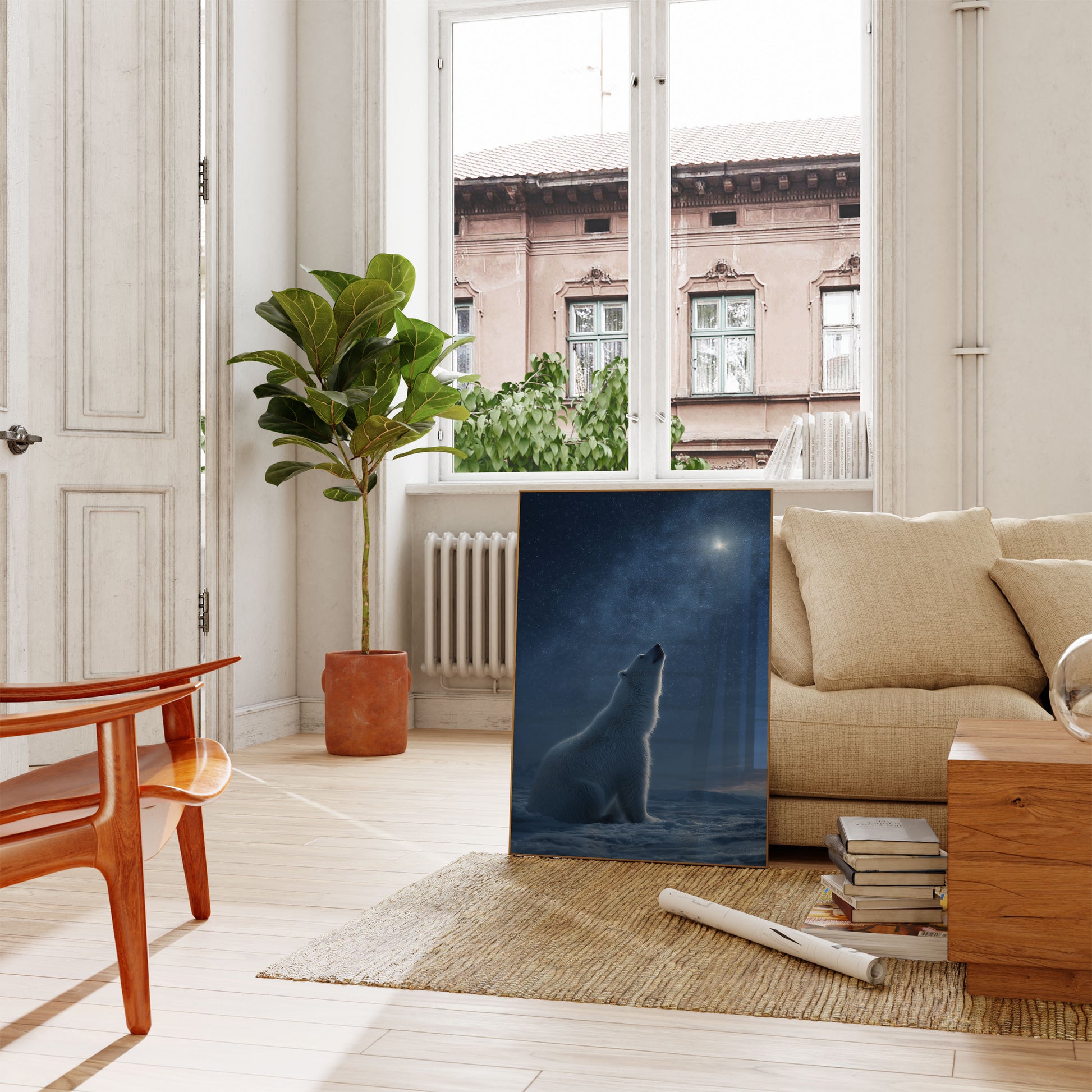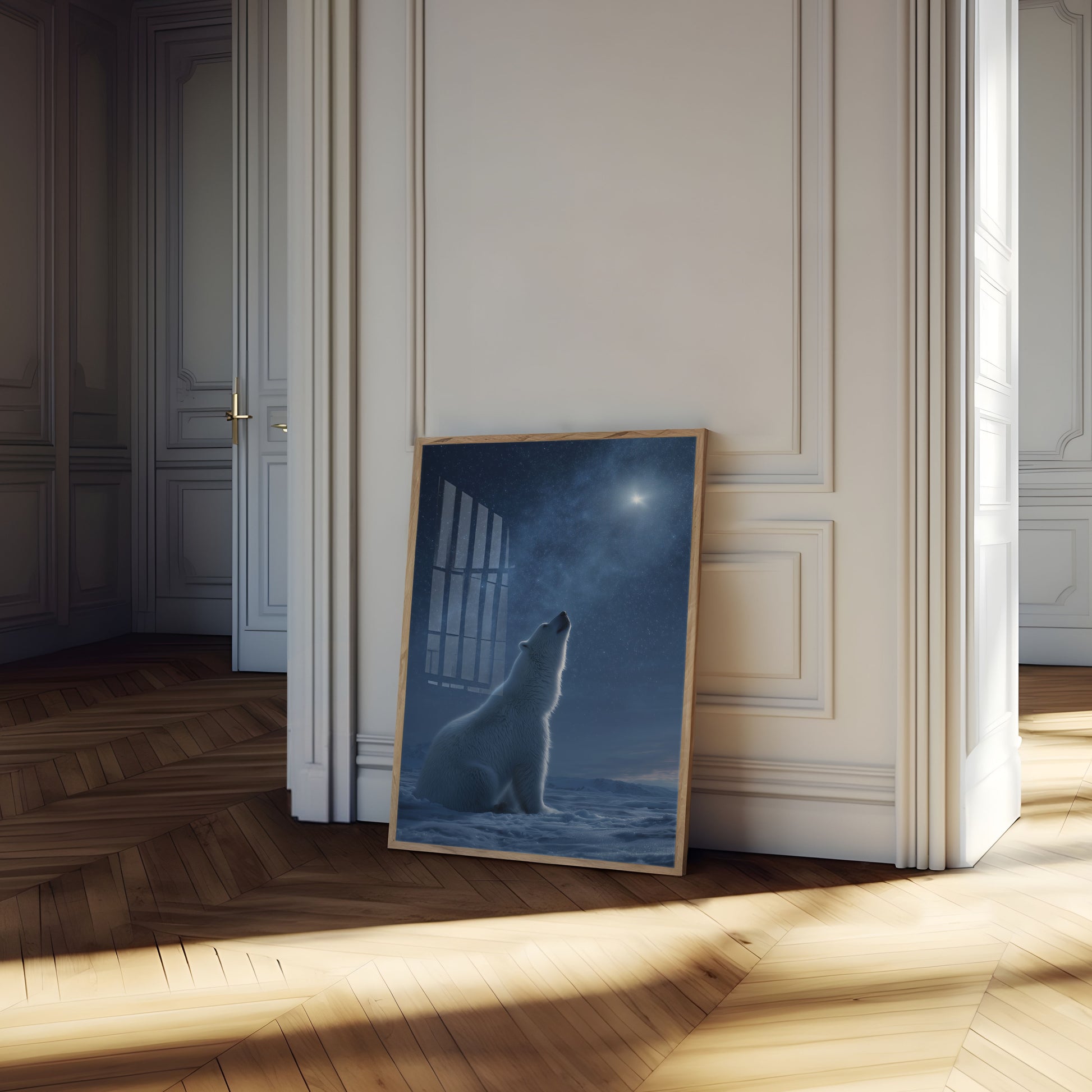 A majestic polar bear sits silently under a star-filled midnight blue sky, gazing up at a luminous moon. The ethereal white creature stands amid a frozen landscape, its fur glowing softly against the stark, icy wilderness. This breathtaking image captures the serene beauty and solitude of the Arctic wilderness, inviting viewers into a moment of profound tranquility and wonder.