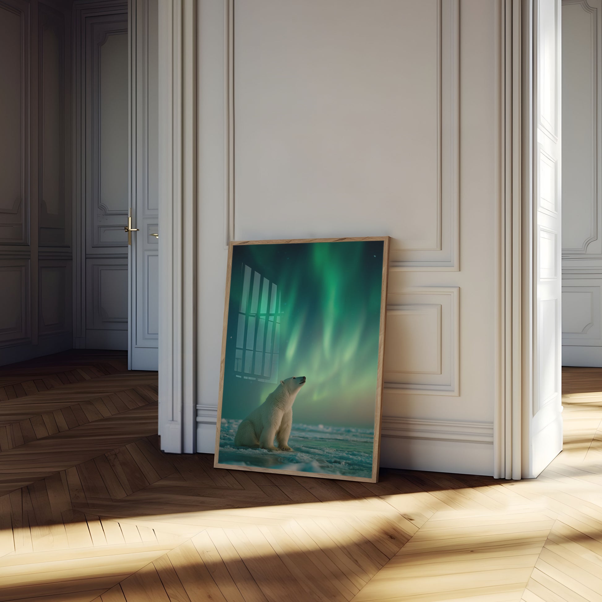 A majestic polar bear sits in quiet contemplation beneath the mesmerizing emerald waves of the aurora borealis. The stark white bear blends perfectly with the icy landscape, creating a breathtaking scene of wilderness and natural wonder. Soft green and teal northern lights dance across the night sky, casting an ethereal glow over the frozen Arctic seascape.