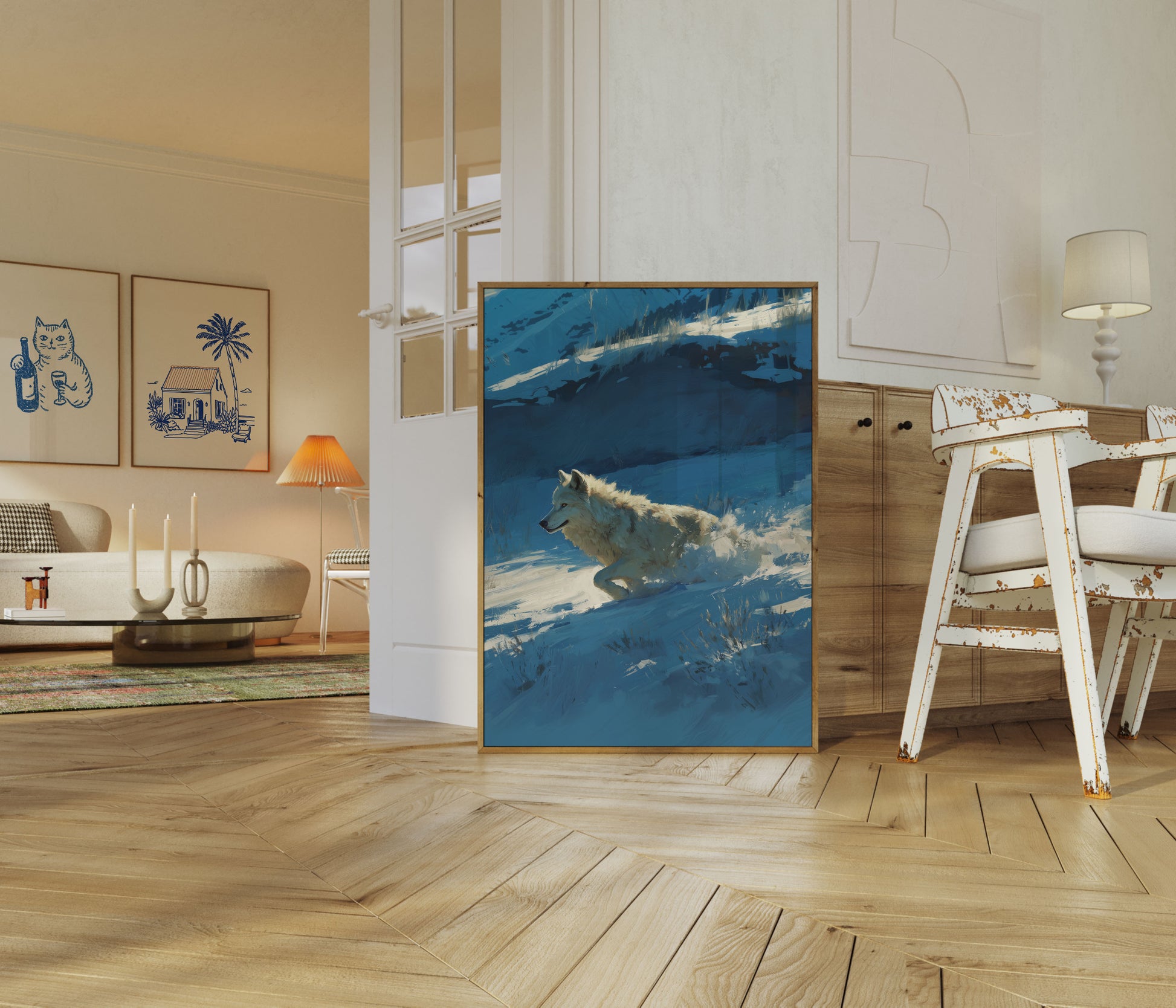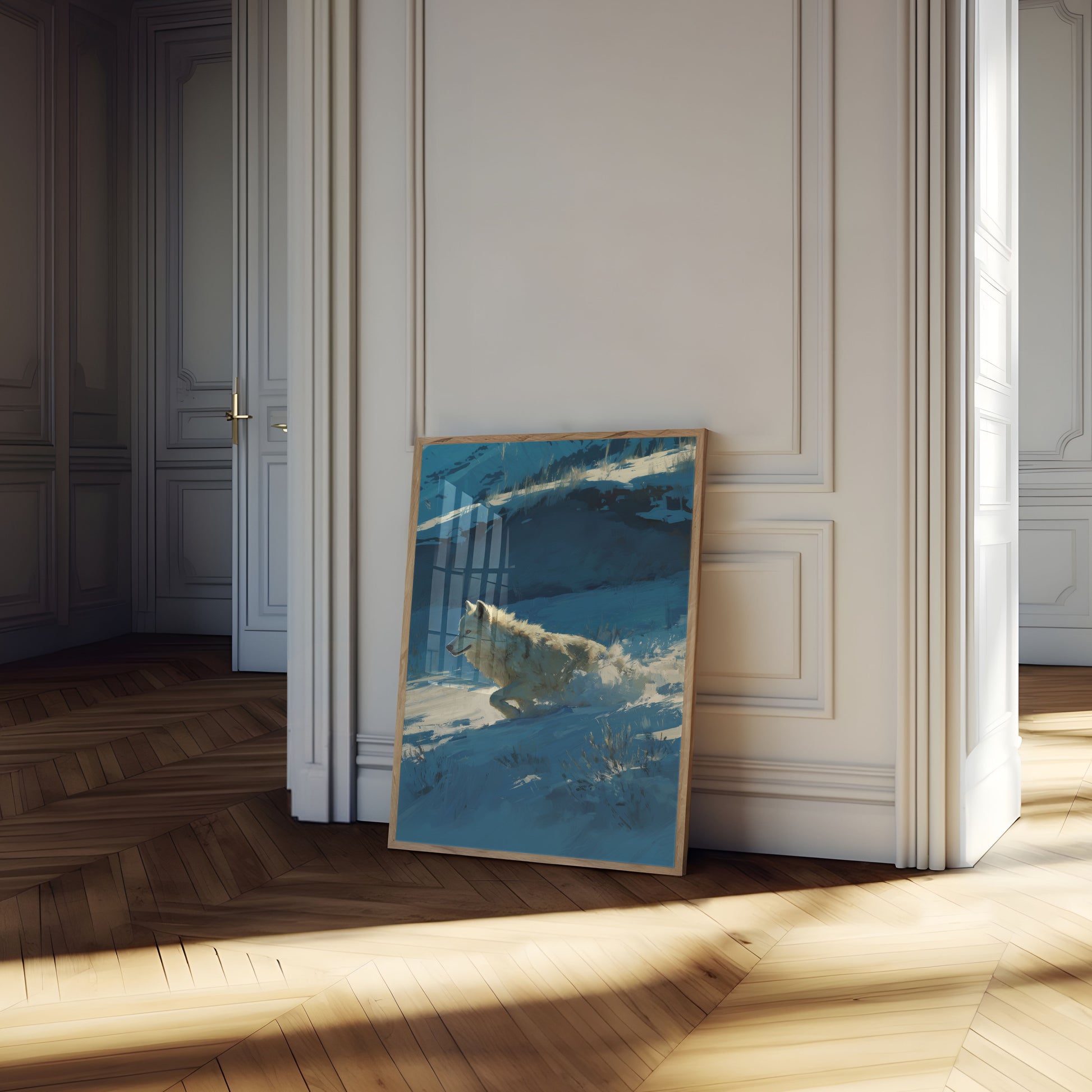 Immerse yourself in the raw power and beauty of a lone wolf racing through a crystalline winter landscape. This stunning art piece captures the wolf's dynamic movement against a mesmerizing palette of deep blues and white snow, showcasing the animal's incredible grace and wild spirit. The intricate brushstrokes and atmospheric color gradients transform this wildlife scene into a breathtaking visual journey through a frozen wilderness.
