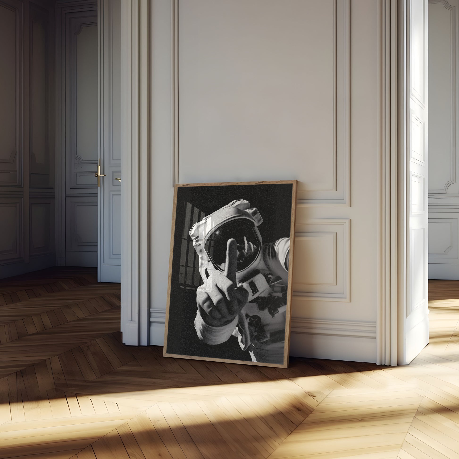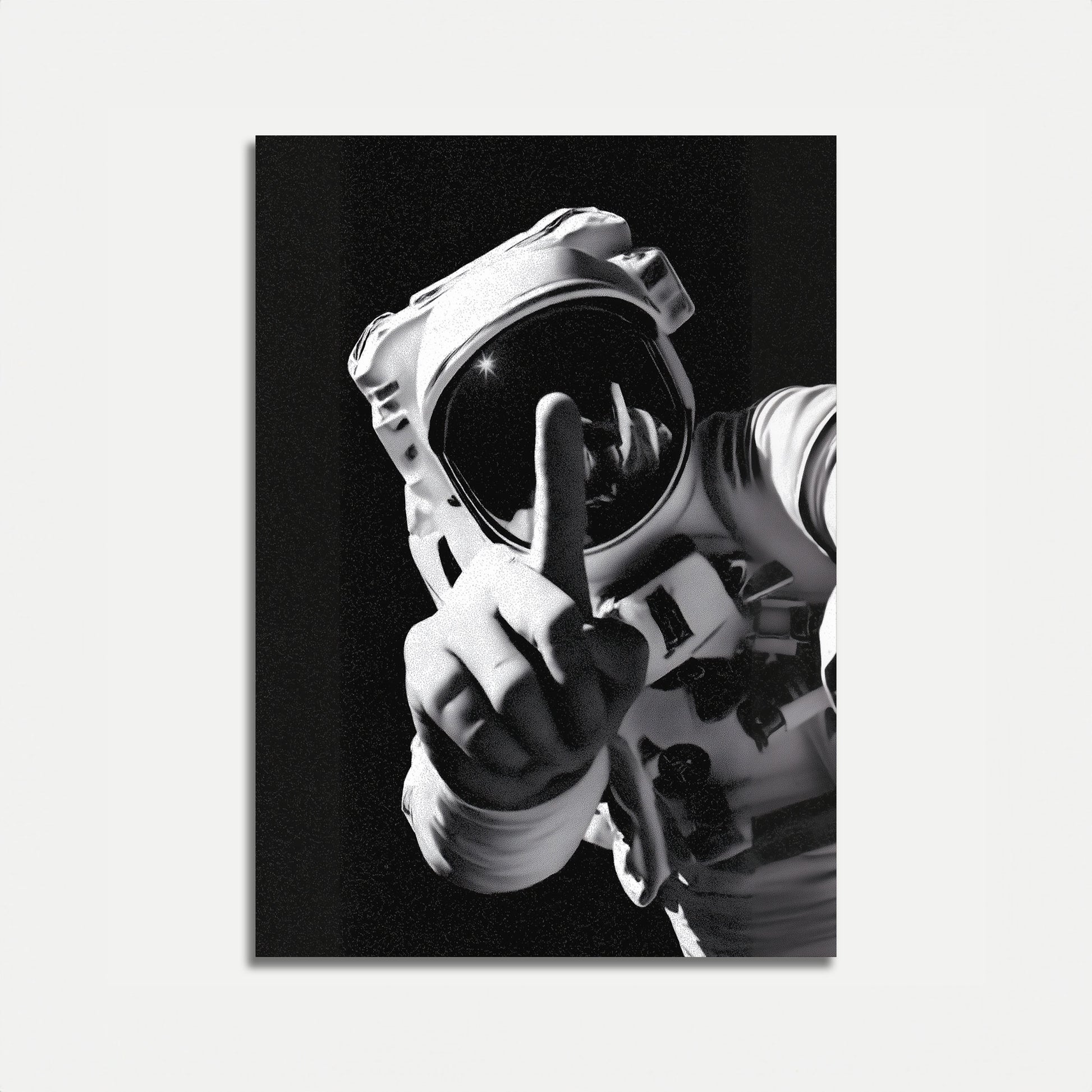 A provocative black and white image of an astronaut in a detailed space suit, making a bold gesture against the dark cosmic background. The striking monochrome composition captures the defiant spirit of space exploration with raw, unapologetic attitude. A statement piece that challenges traditional perceptions of astronauts and space imagery.