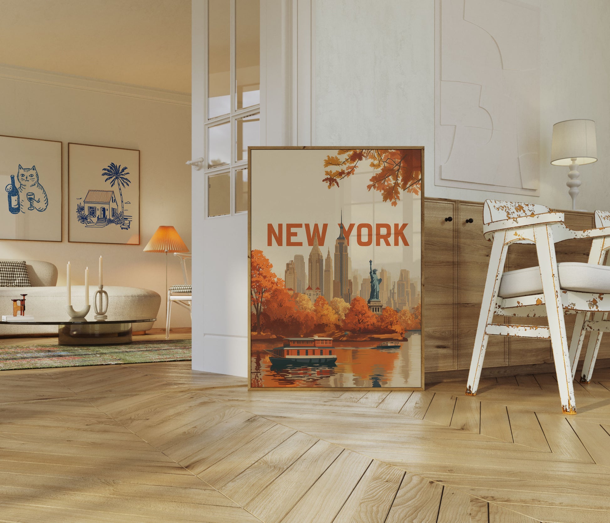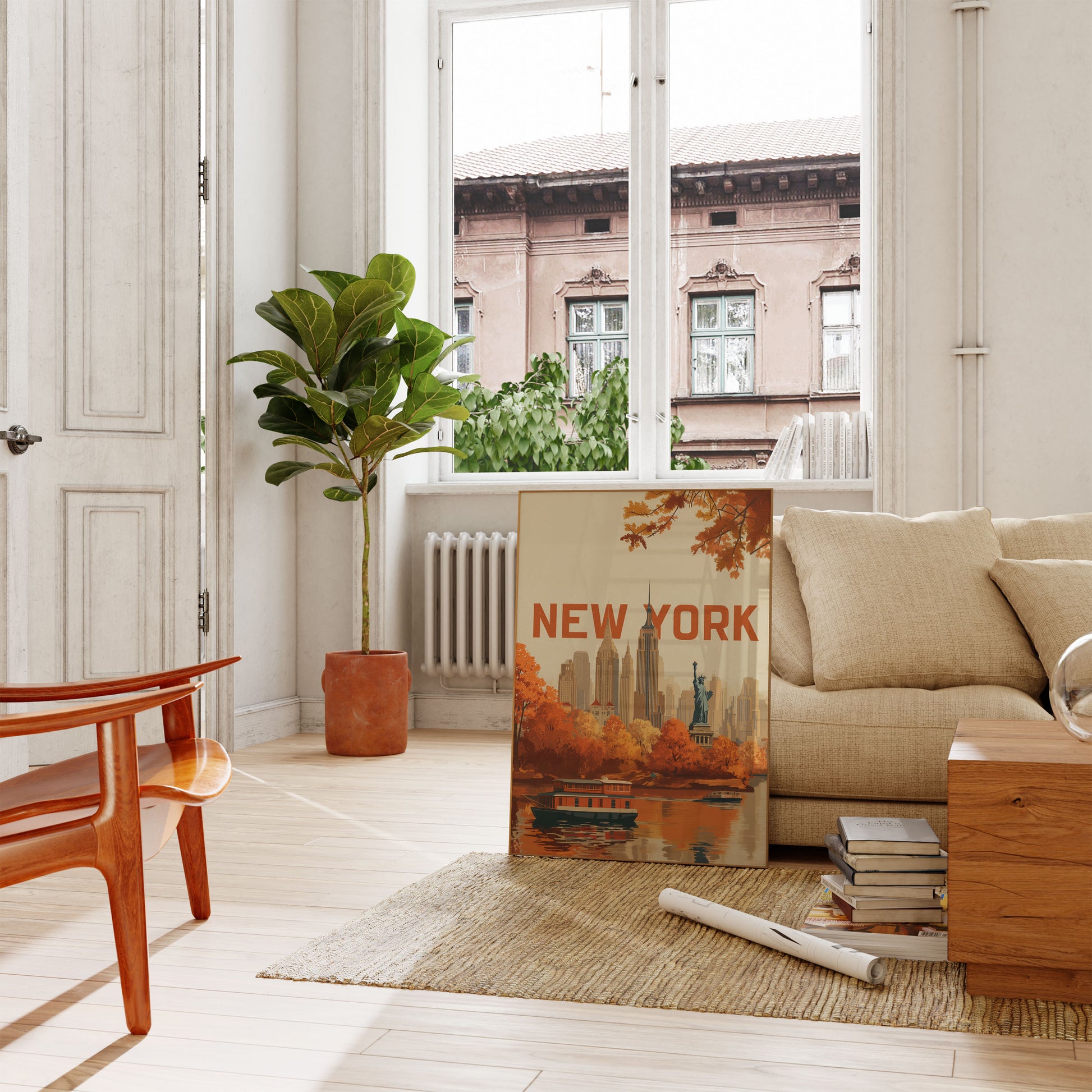 Immerse yourself in the breathtaking beauty of New York City during fall, where golden-orange autumn leaves frame an iconic cityscape. This vintage-inspired poster captures the magical essence of the city, featuring the Empire State Building, Statue of Liberty, and serene waterfront boats against a warm, nostalgic color palette. A stunning tribute to the urban landscape and seasonal splendor of the Big Apple.
