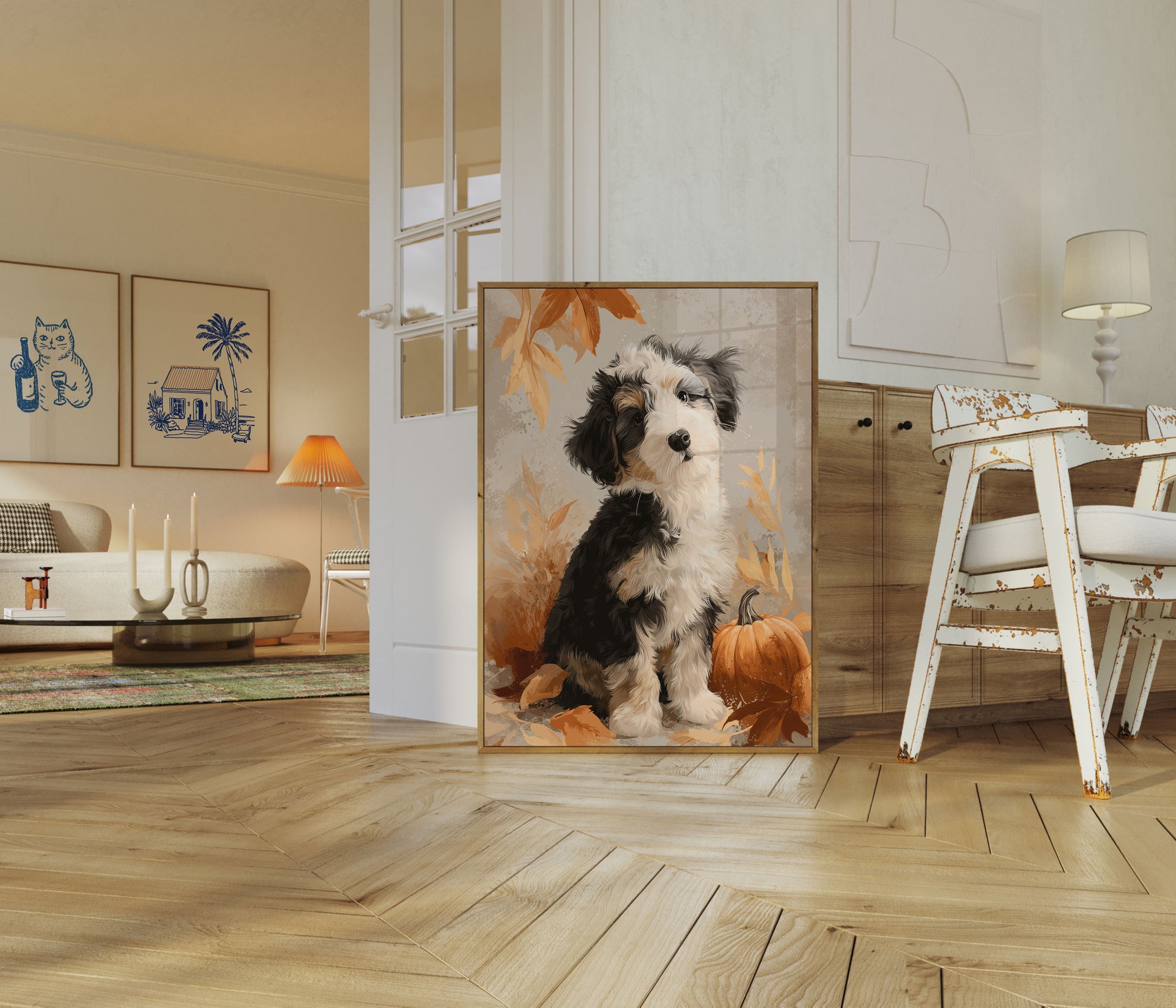 A charming black and white puppy sits surrounded by golden autumn leaves and a rustic pumpkin, creating a warm and inviting seasonal scene. This adorable portrait captures the pure joy and innocence of a young dog against a soft, textured background that evokes the cozy feelings of fall.