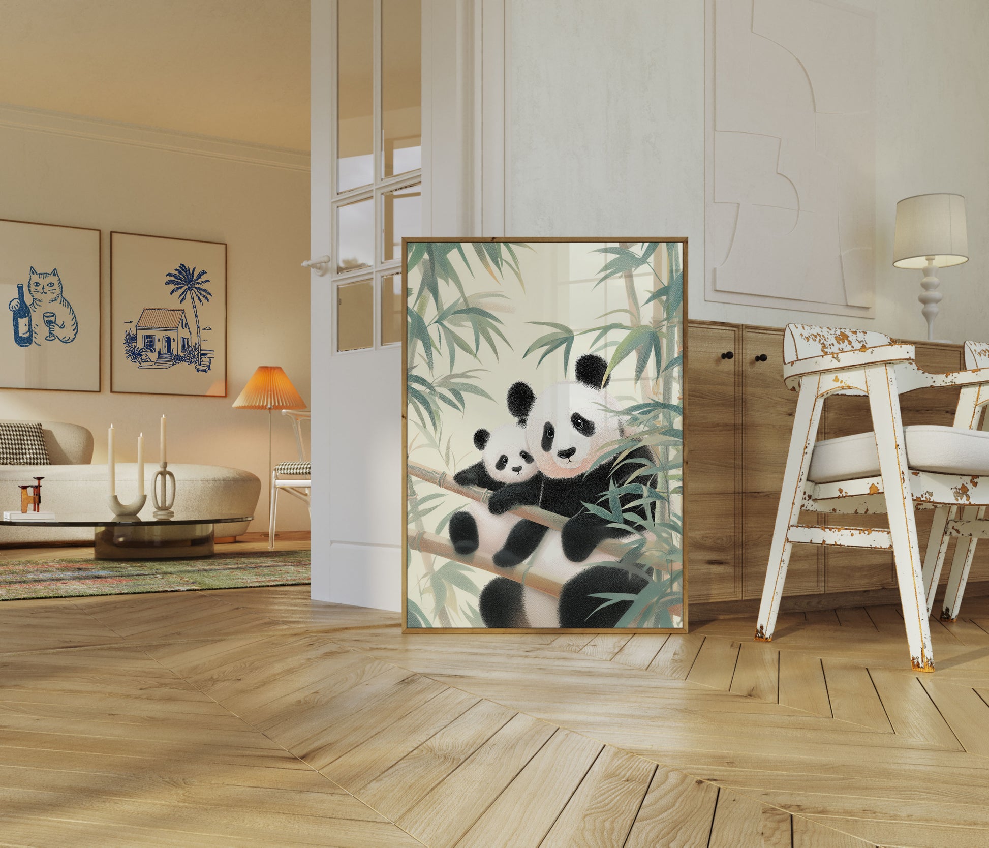 Discover a serene sanctuary of adorable companionship with this enchanting illustration of a panda parent and child nestled among soft, sage-toned bamboo leaves. The delicate artwork captures the gentle bond between the two pandas, rendered in a dreamy, textured style that brings a sense of tranquility and natural harmony to any space.