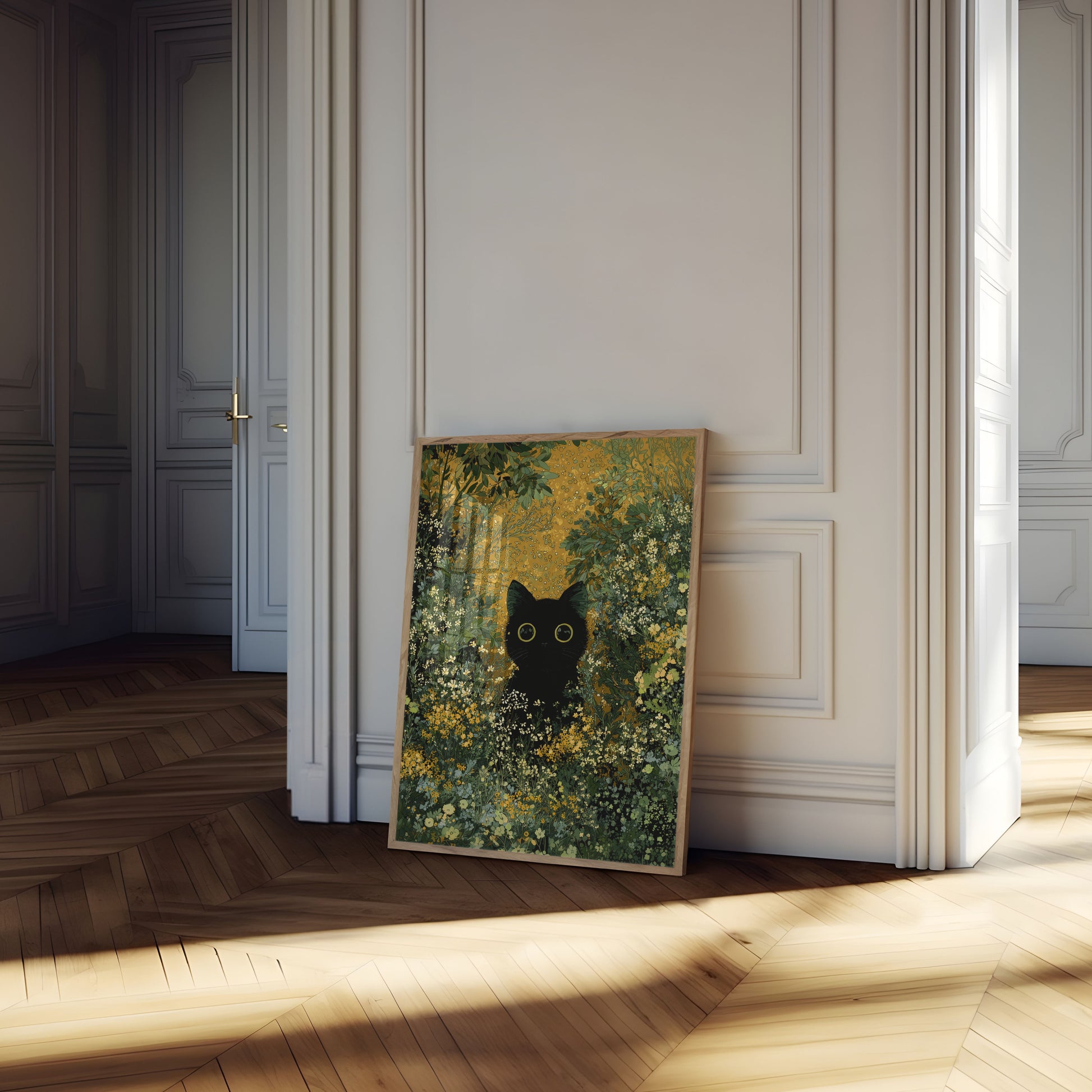 A mesmerizing artwork featuring a sleek black cat with luminous green eyes nestled amidst a lush garden of golden and green flowers. The intricate illustration captures a magical moment where the dark silhouette of the cat emerges from a vibrant landscape of delicate blossoms and leaves, creating a captivating scene of natural harmony and mystery.
