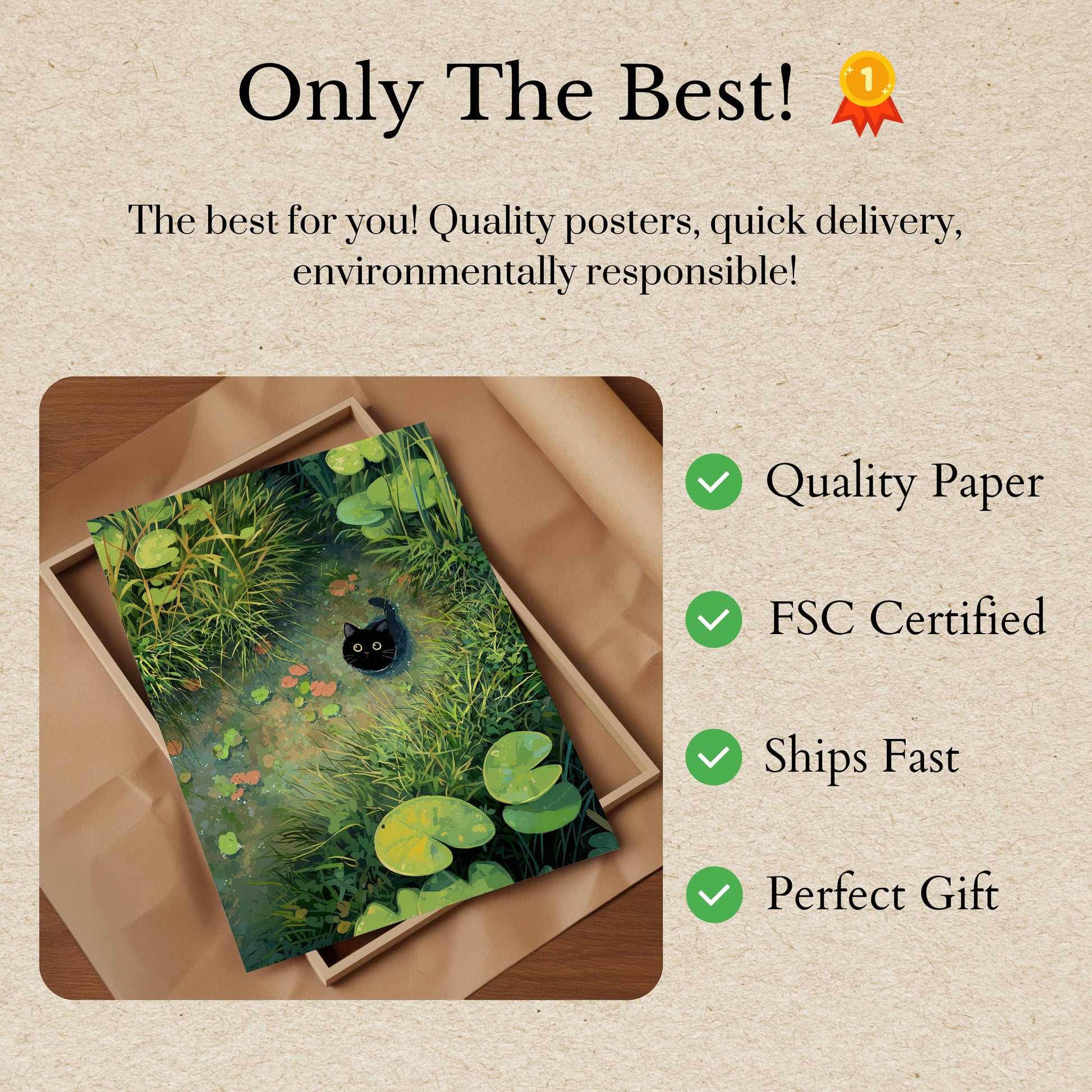A charming artwork depicting a curious black cat peering through lush green lily pads and grasses. Soft, verdant tones create a serene and enchanting aquatic scene with delicate watercolor-like textures. The adorable cat's wide eyes peek out from the tranquil pond, inviting viewers into a magical miniature world of nature and feline wonder.