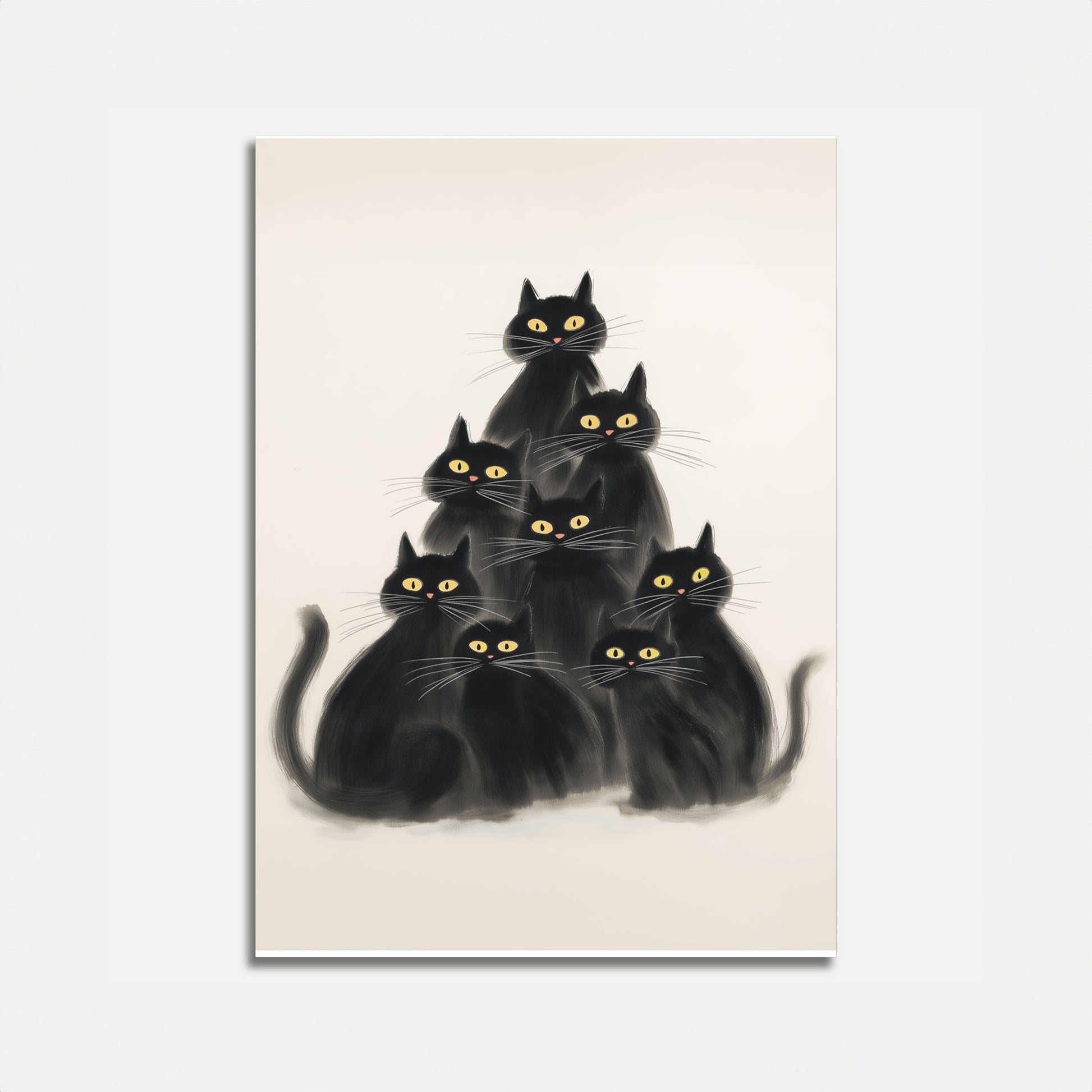 A charming cluster of seven sleek black cats arranged in a mesmerizing pyramid formation, each sporting luminous yellow eyes that pierce through their silky fur. This stylized artwork captures the mysterious and elegant nature of felines, creating a captivating visual symphony of dark silhouettes and piercing gazes. Perfect for cat lovers who appreciate minimalist, sophisticated design.