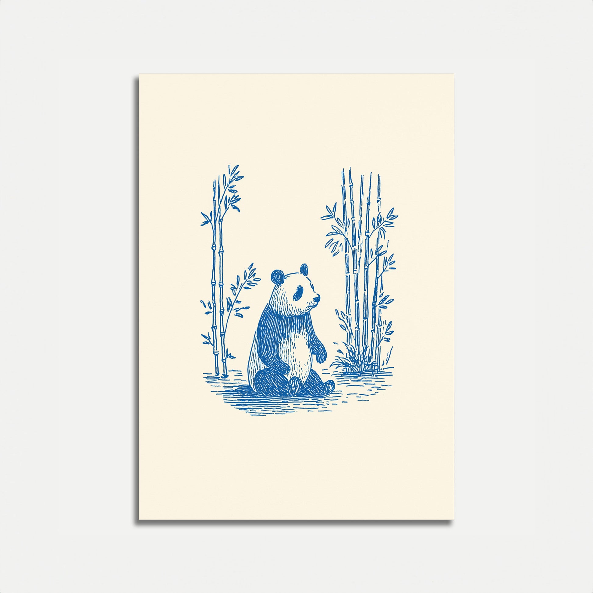 Discover a serene blue and white illustration of a gentle panda sitting amidst a tranquil bamboo grove. This delicate, hand-drawn style artwork captures the peaceful essence of the beloved bear in a minimalist, elegant design that brings a touch of nature's calm to any space.