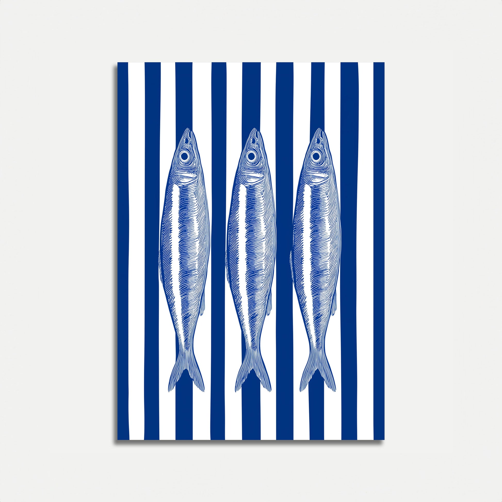 Three elegant sardines swim against a bold blue and white striped background, creating a mesmerizing marine-inspired design. The intricate line art captures the sleek movement and delicate details of these oceanic creatures with stunning precision. A minimalist yet striking artwork that brings the beauty of sea life into your living space.