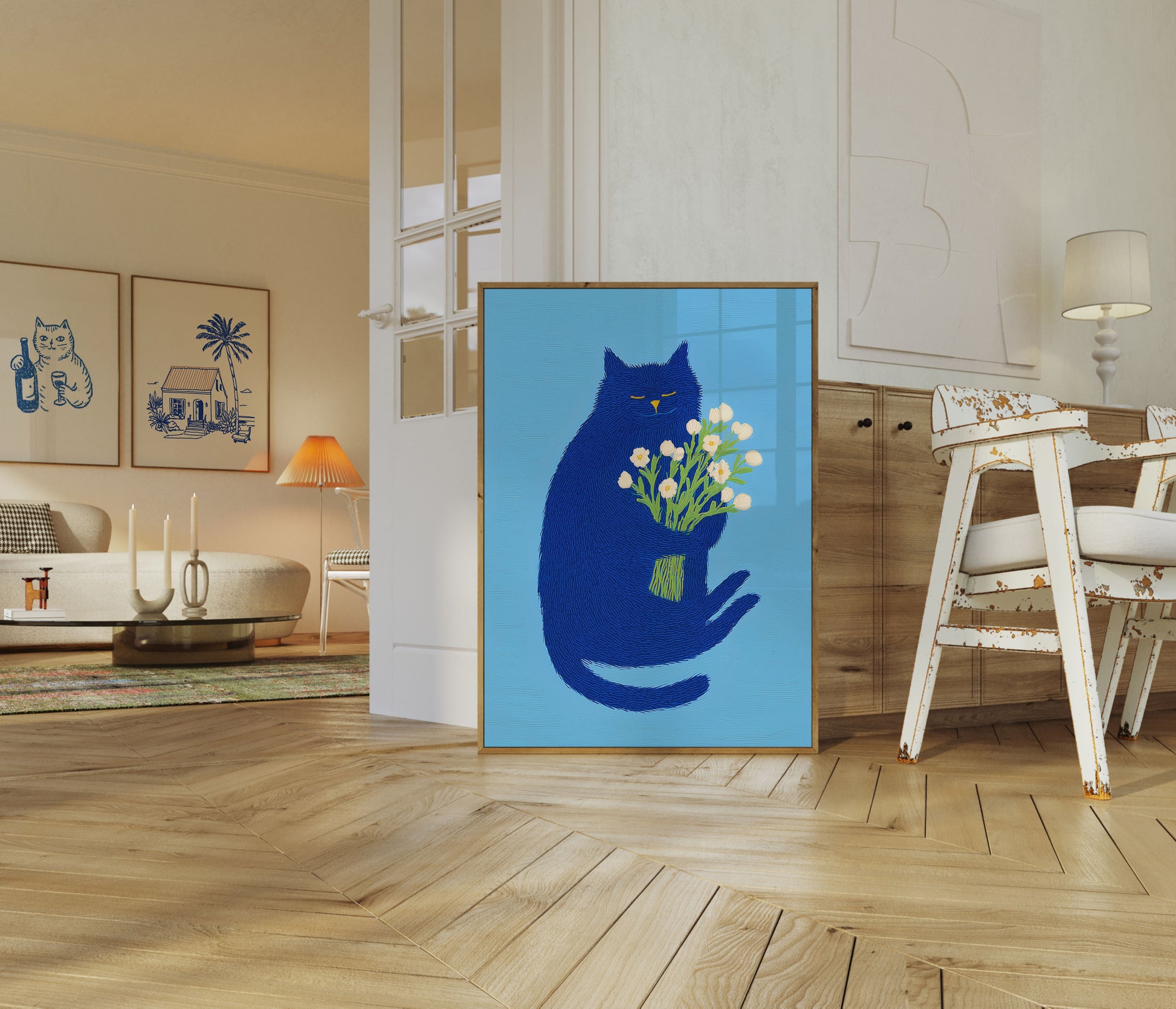 Immerse yourself in tranquility with this enchanting illustration of a deep blue cat, eyes softly closed, tenderly hugging a delicate bouquet of white and yellow flowers. The serene creature radiates calm against a soothing blue background, creating a meditative visual experience that brings a sense of gentle joy and peaceful connection. This charming artwork captures the subtle bond between nature and companionship in a beautifully minimalist style.