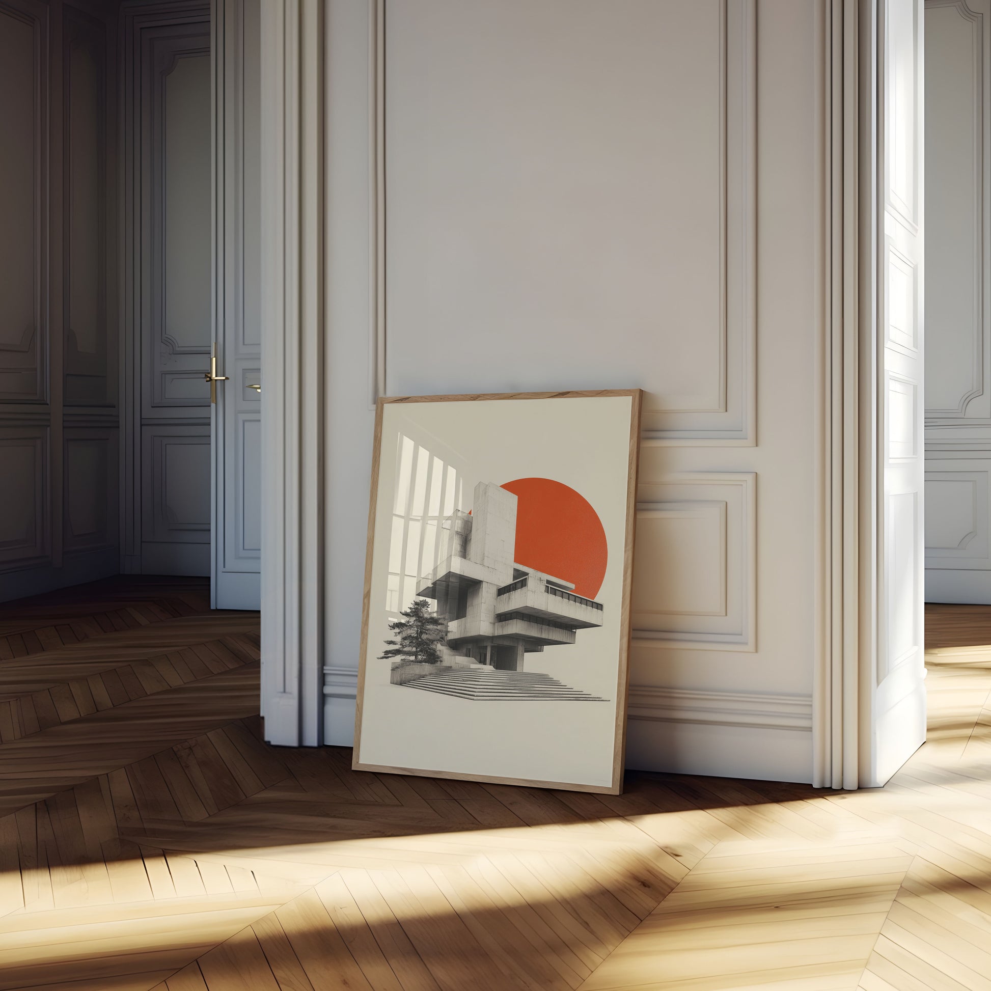 A striking architectural composition that captures the raw beauty of brutalist design, featuring a geometric concrete structure set against a vibrant orange sun. The image blends stark architectural lines with a solitary tree, creating a powerful contrast between organic and constructed forms. This minimalist art piece explores the interplay of light, shadow, and architectural precision in a mesmerizing visual narrative.