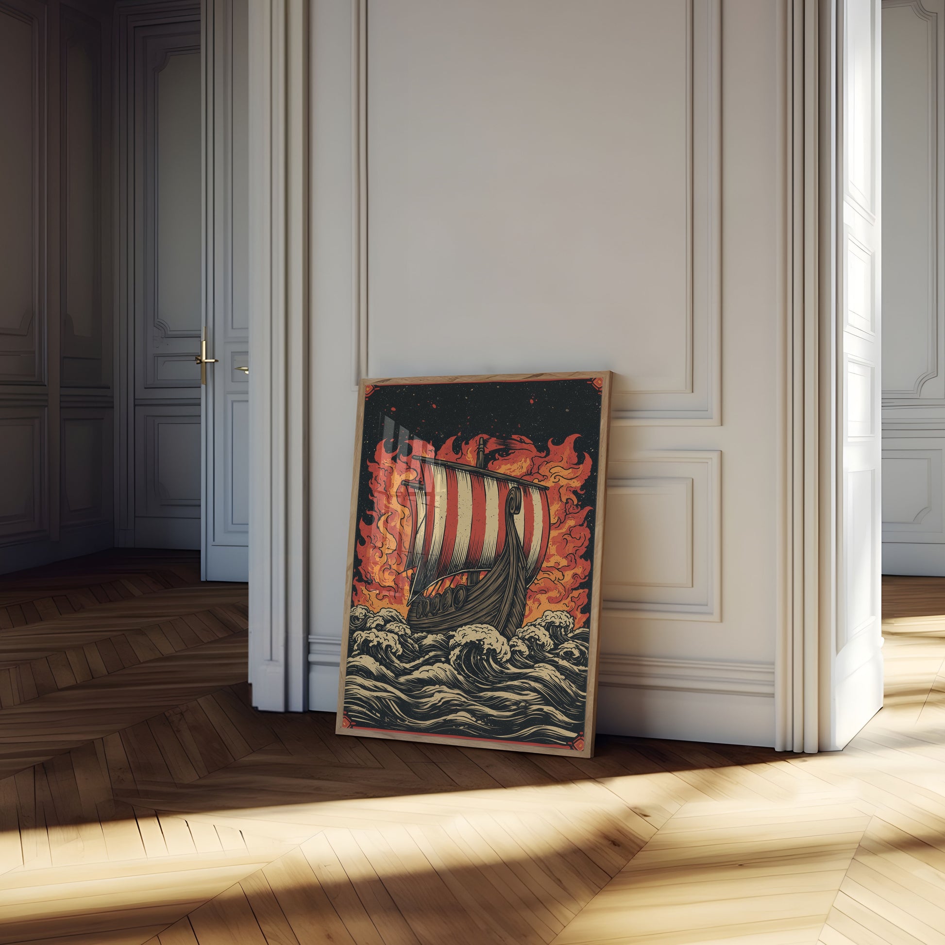 Immerse yourself in the raw power of Viking maritime legend with this dramatic artwork depicting a classic longship sailing through turbulent, flame-engulfed waters. Bold red and orange flames dance around the meticulously detailed vessel, creating an intense and epic visual narrative of Norse seafaring adventure. The intricate illustration captures the spirit of exploration, danger, and mythic heroism.