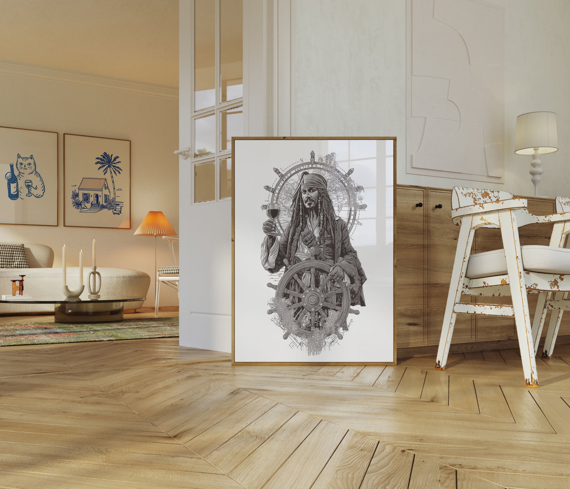 Dive into the intricate world of high-seas adventure with this stunning black and white illustration featuring a legendary pirate captain at the helm. Detailed and dramatic, the artwork captures the essence of maritime exploration, showcasing the character's intensity against a backdrop of an antique world map and an ornate ship's wheel. Every line tells a story of freedom, mystery, and the endless call of the ocean.
