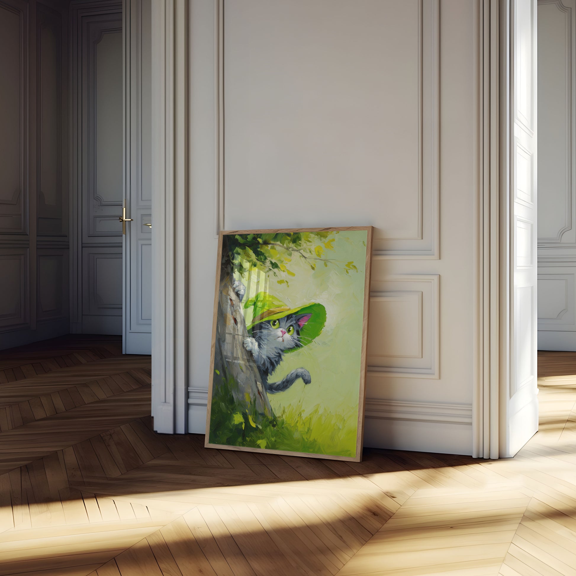 A charming oil painting captures a fluffy gray cat peeking from behind a tree, wearing an oversized bright green leaf as a playful hat. The soft, impressionistic background of gentle green and yellow hues creates a dreamy, whimsical forest scene that brings a touch of magic and humor to the artwork.