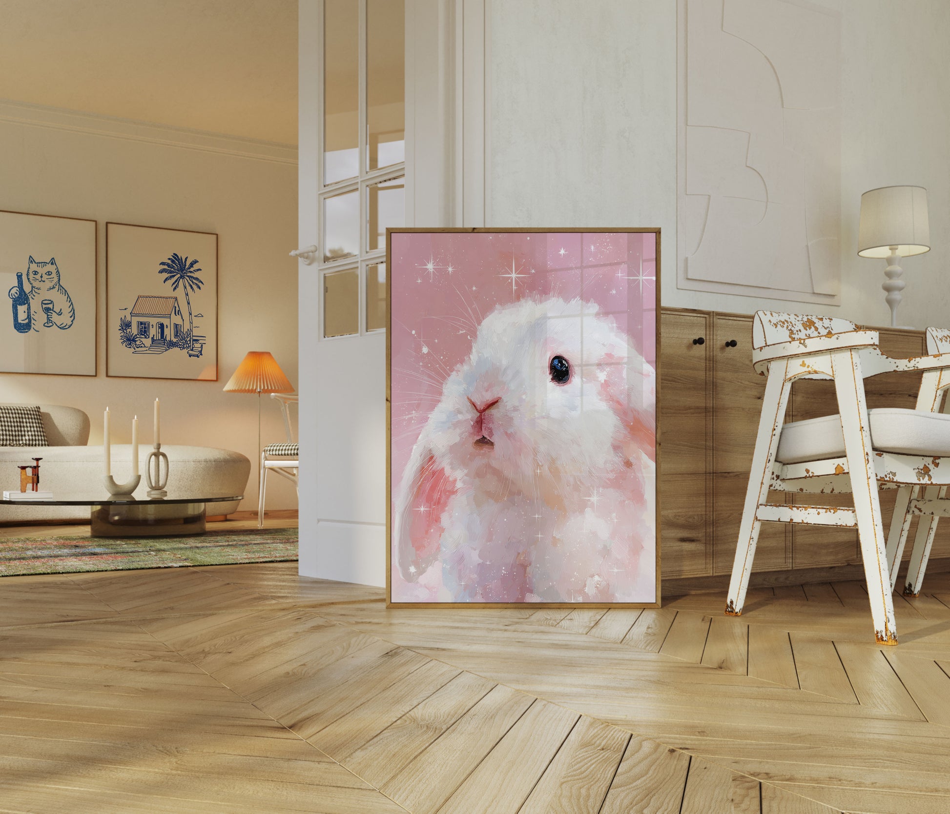 A dreamy white rabbit emerges from a soft pink starry background, radiating ethereal magic and gentle charm. The delicate artwork captures the rabbit's exquisite fur details and luminous eye, surrounded by twinkling stars that create a sense of celestial wonder.